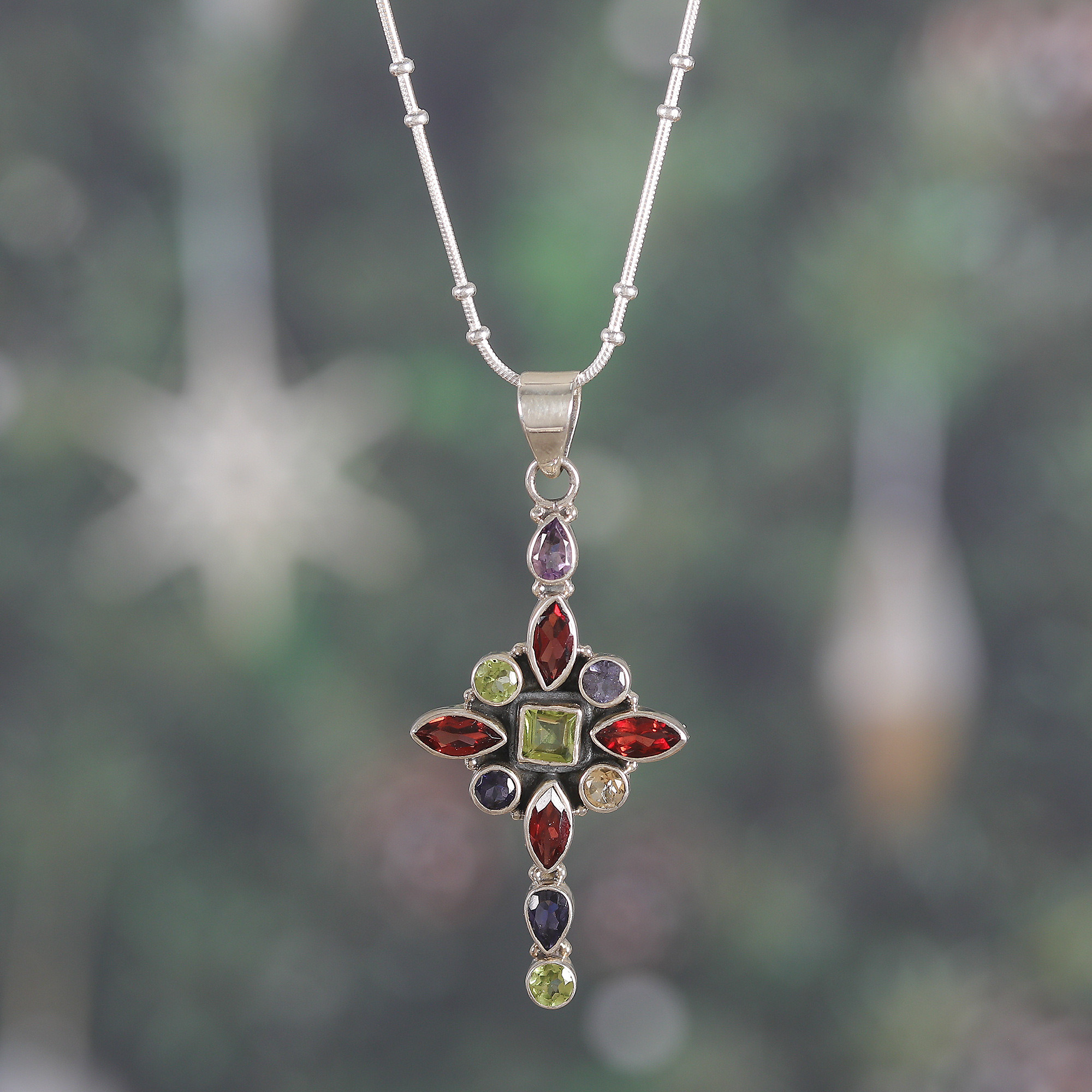 Precious gems shine along a classic design inspired by faith and hope. Crafted in the distant Indian region and presented by Neeru Goel, this five-carat necklace displays gorgeous stones of garnet, peridot, iolite, citrine and amethyst along its cross pendant. Polished and oxidized finishes decorate the piece, adding a unique essence to the jewel's colors.