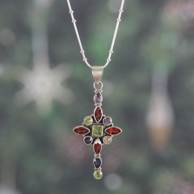 Cross-Themed 5-Carat Faceted Multi-Gemstone Pendant Necklace, 'Legacy of Faith'