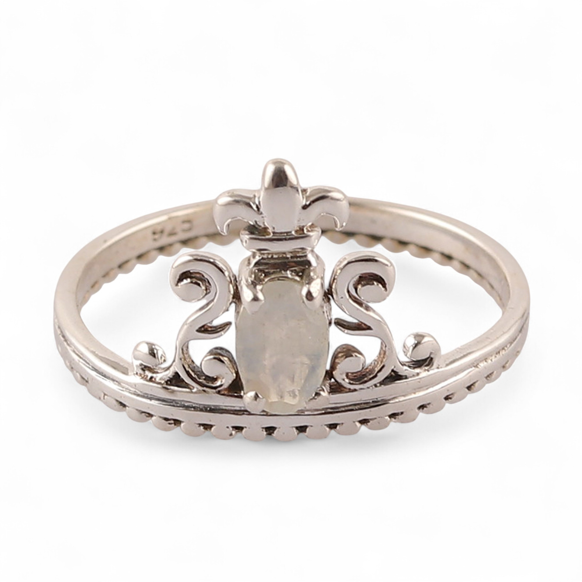 An iridescent rainbow moonstone is gracefully set within an ornate, crown-inspired sterling silver frame, complete with delicate scrollwork and a fleur-de-lis accent on top, symbolizing elegance and regality. The beaded detailing along the band adds a refined vintage touch, making this cocktail ring unique and timeless. A perfect blend of mystical charm and royal sophistication, this accessory presented by India's Chintan is ideal for those who appreciate jewelry with symbolic artistry.