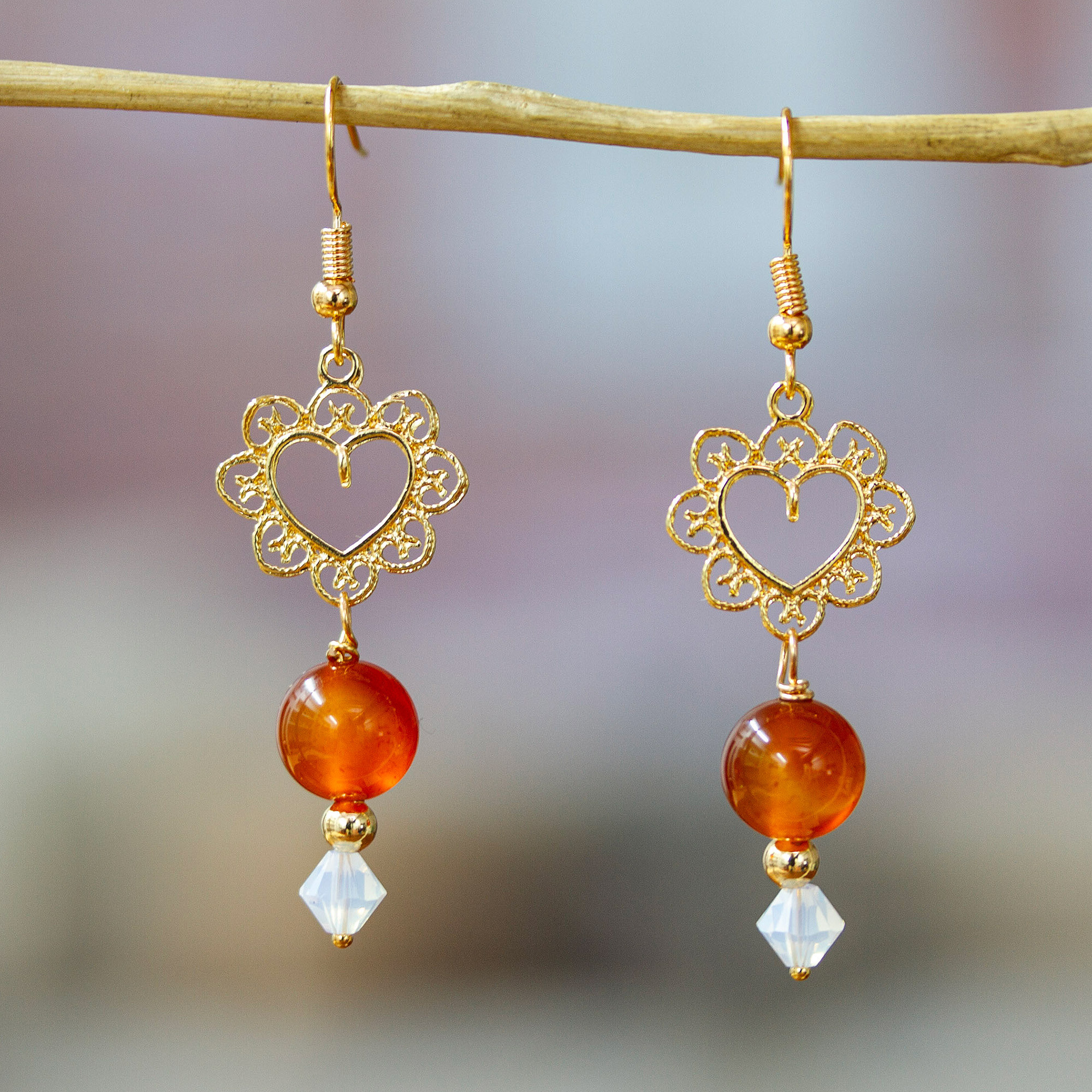 Polished gold is beautifully complemented by carnelian beads and genuine Swarovski crystals in these dangle earrings from Mexico's Alejandra Aceves. The earrings are crafted from 14k gold-plated steel in the shape of filigree hearts.