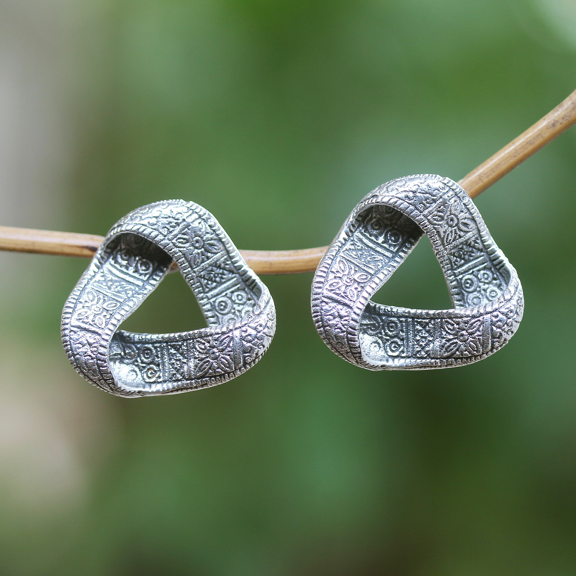 Songket cloth creates two entrancing Mobius strips that adorn the ears, handcrafted of sterling silver by Balinese artisan Dewa Arimbawa. Songket is a traditional type of decorative cloth woven from silk or cotton with shimmering metallic threads. The elegant nature of songket is captured in this pair of button earrings, featuring intricate designs accented by a combination of finishes.
