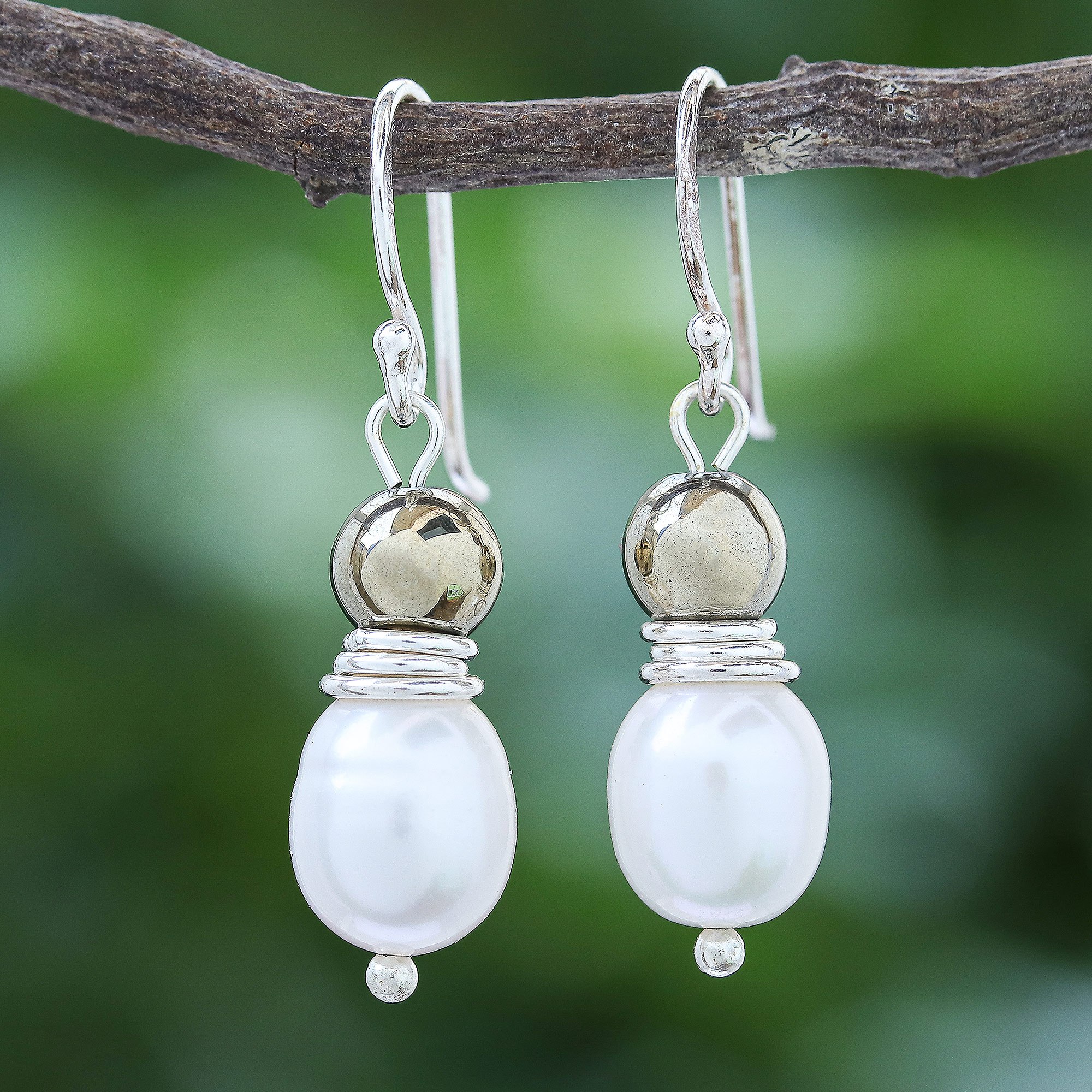 Wearing these lovely dangle earrings designed by Thailand's Tipa will feel like taking a breath of fresh sea air. The artisan hand threads glowing freshwater pearls and shimmering hematite gemstones to create the earrings, then finishes them with gleaming sterling silver hooks.