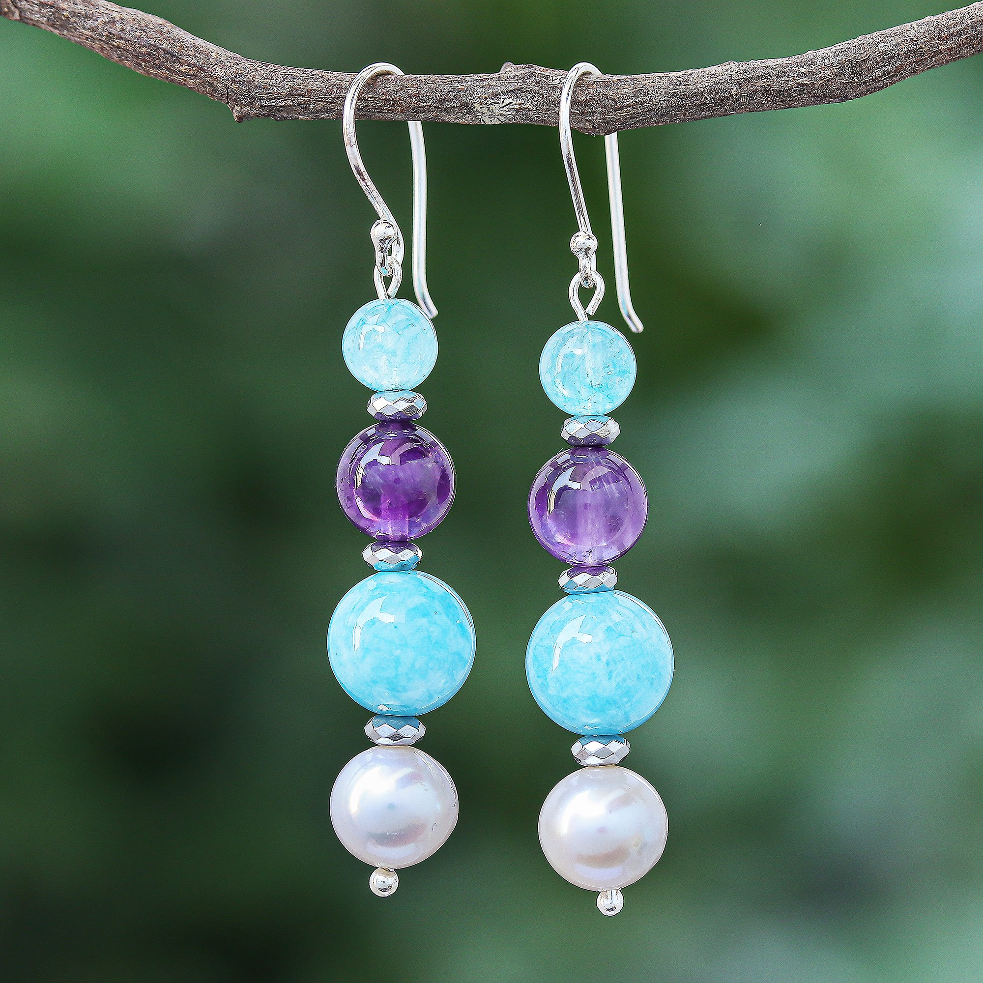 Infuse a jolt of electricity into your next ensemble with these adventurous dangle earrings designed by Thailand's Matta. The artisan hand threads purple amethyst, blue quartz, glowing cultured pearl, and gleaming hematite beads to create the earrings, finishing the pair with shining sterling silver hooks.