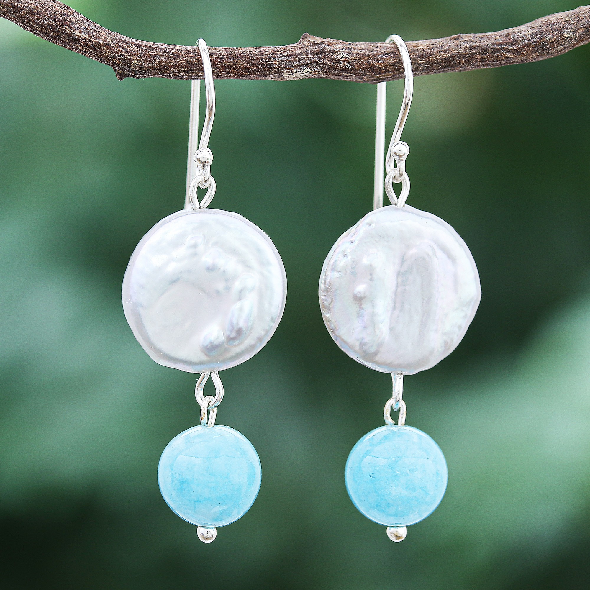 An iridescent coin pearl give these earrings, designed by Thailand's Matta, a unique look. The artisan uses a cultured freshwater pearl to create the earrings, while a blue quartz bead dangles elegantly below. Shining sterling silver hooks finish the pair in style.
