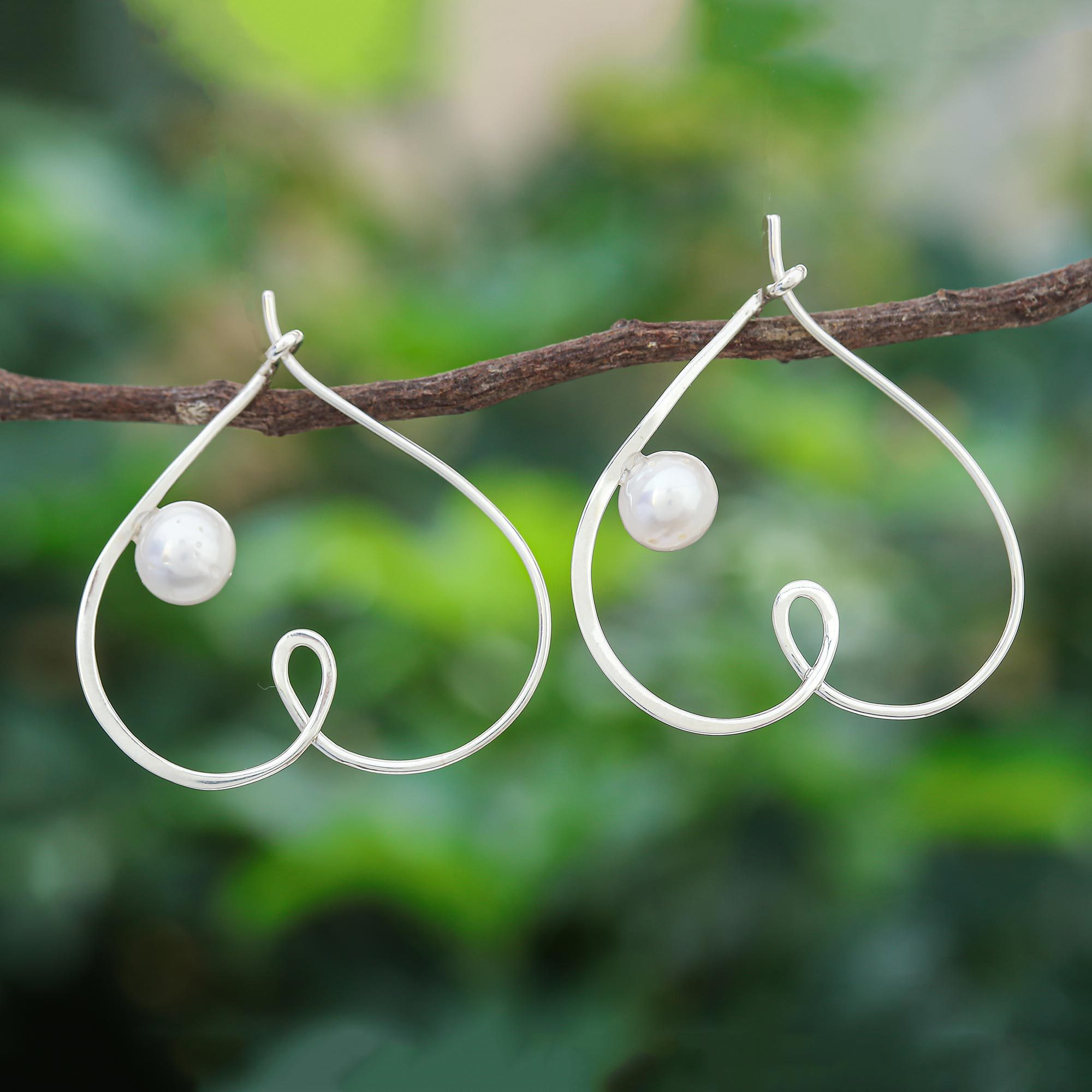 Cultured Freshwater Pearl and Sterling Silver Heart Earrings, 'Loopy for Love'