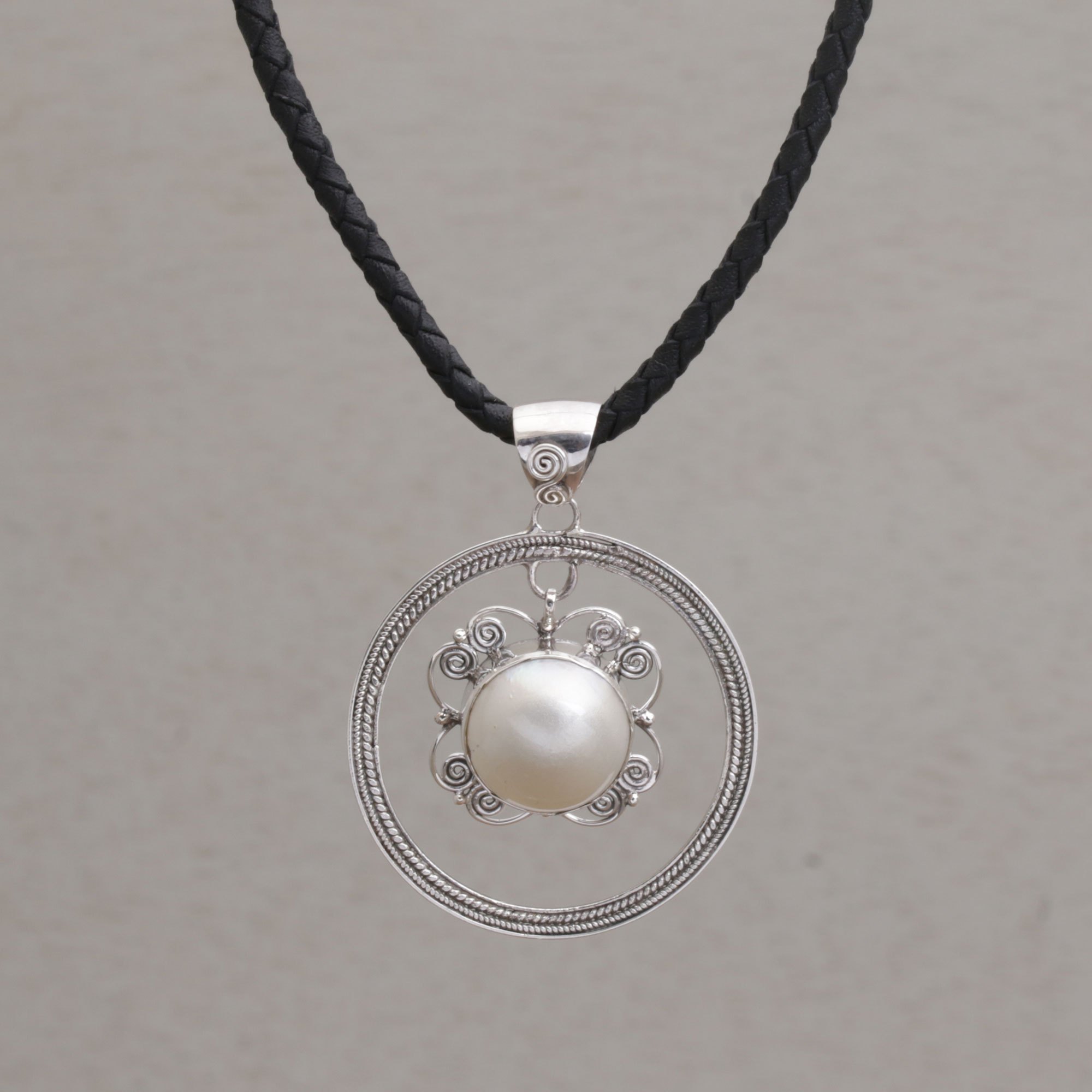A luminous cultured pearl sits as the centerpiece of this pendant necklace from Balinese artisan Made Sudiari. Surrounded by sterling silver spirals, the gem dangles inside of a ring with a braided motif, which in turn hangs from a woven leather cord. The dark color of the leather and the combination finish of the surrounding ring complement the radiance of the pearl, giving the necklace an enchanting allure.