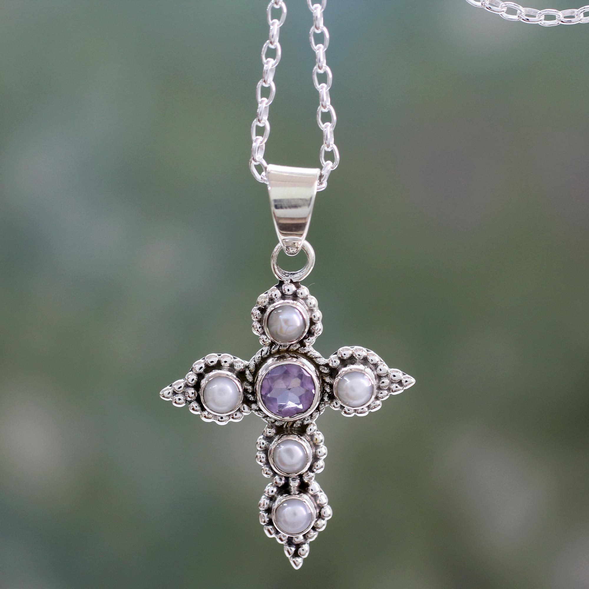 Five radiant pearls shine alongside an impressive carat of translucent purple amethyst in this cross pendant from India. Neeru Goel of presents this stunning pendant exuding Christian spirituality on a sterling silver cable chain.