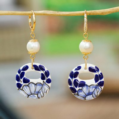 Cultured Pearl and Blue Talavera Ceramic Dangle Earrings, 'Cobalt Eclipse'