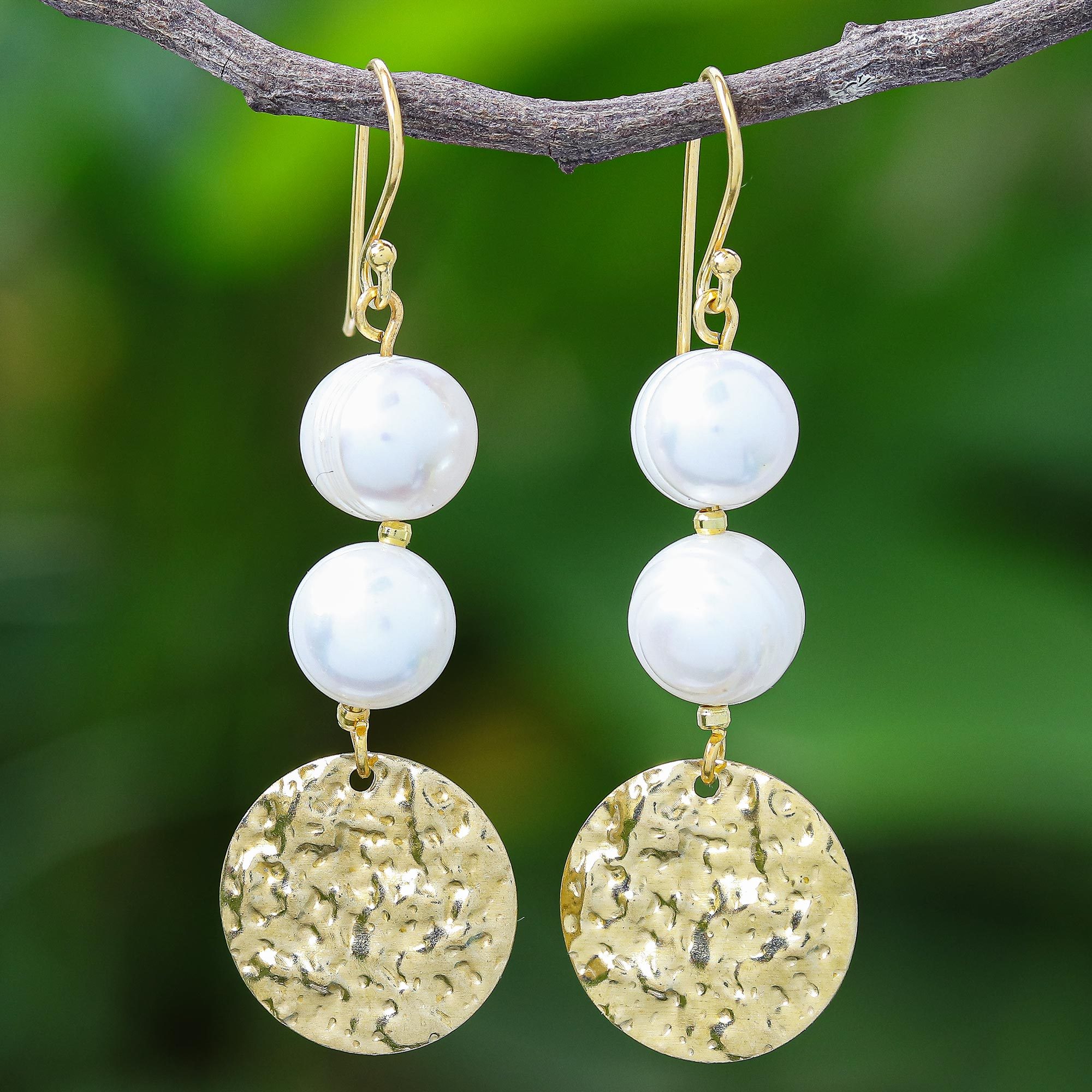 Thailand's Matta presents these shimmering dangle earrings, which feature cultured freshwater pearls dangling from 22-karat gold-plated ear wires. Below, hammered brass discs complement the pearls by catching the light from every angle.