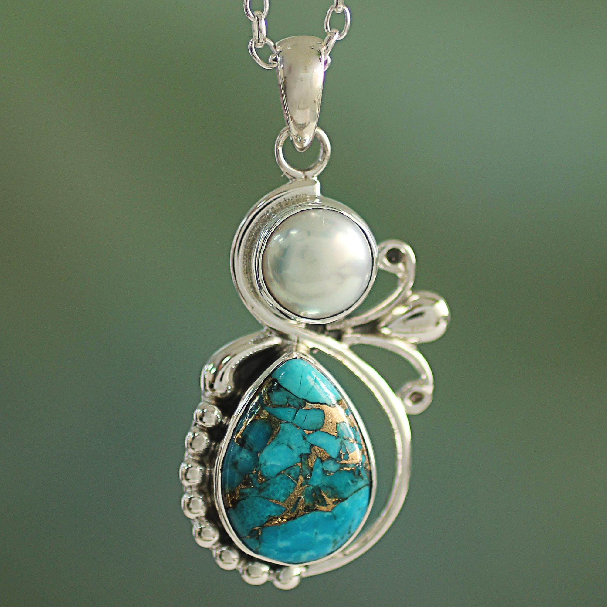 Symbols of a pure heart and mind, pearls are linked with innocence and faith. A white cultured pearl crowns composite turquoise cradled in sterling silver. By Shanker, this necklace evokes billowing white clouds drifting in a joyous sky.