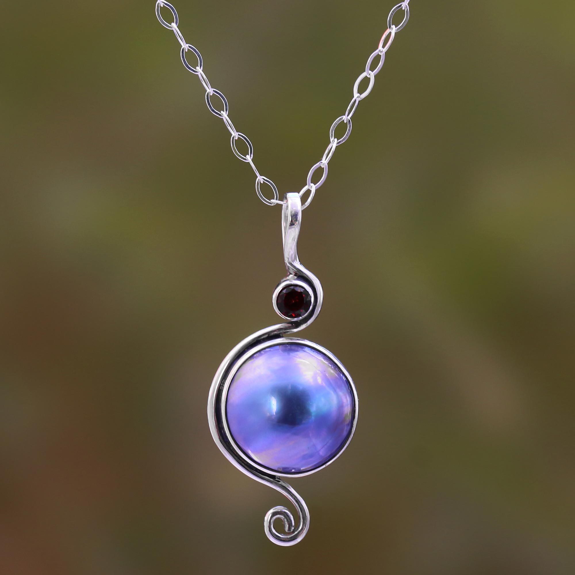 Accentuated by swirling patterns handcrafted from sterling silver, a cultured mabe pearl glows with blue hues, displayed just below a petite faceted garnet gem. Presented as part of the Mutiara Collection in Bali, this pendant necklace adorns the wearer on sterling cable chain.