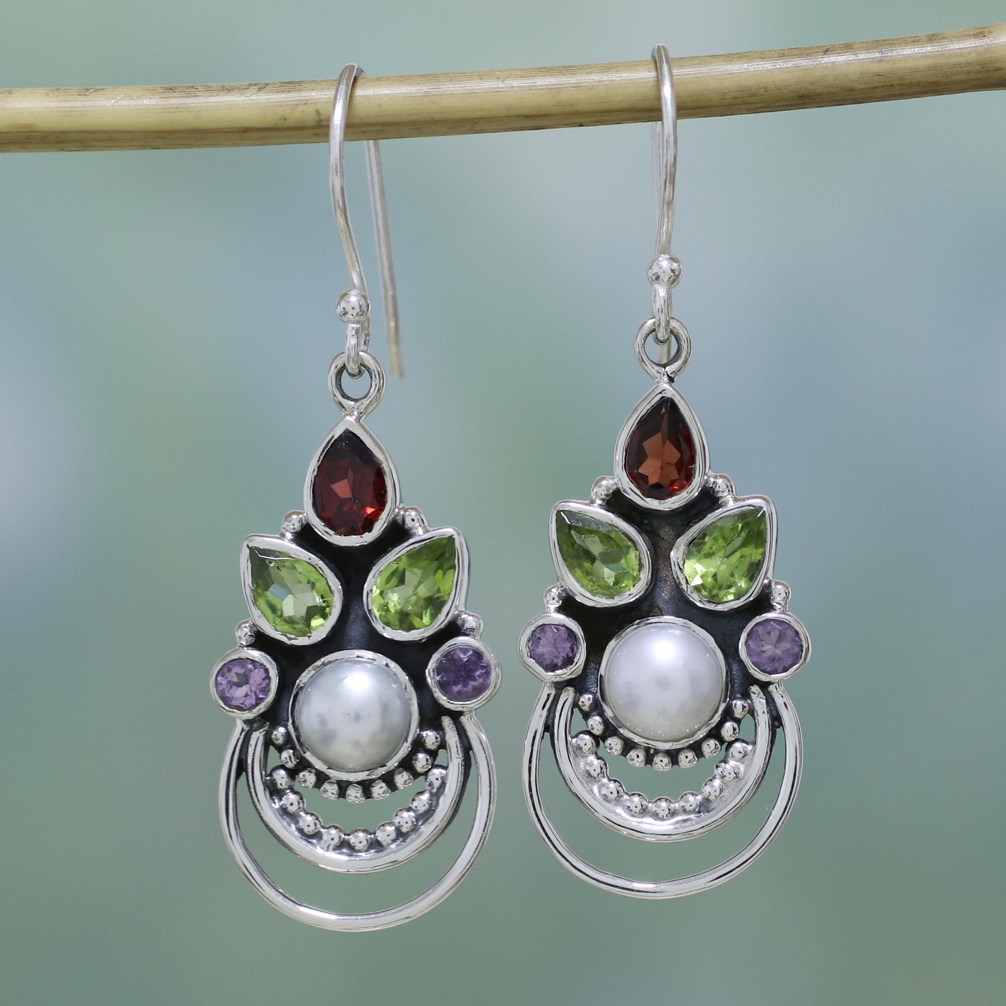 Cabochons of cultured freshwater pearls are crowned with faceted peridot, amethyst and garnet in this pair of dangle earrings presented by India's Neeru Goel. Sterling silver forms swags at the bottom of the earrings, some detailed with dot motifs. The glamorous earrings are set with more than three carats of sparkling gemstones.