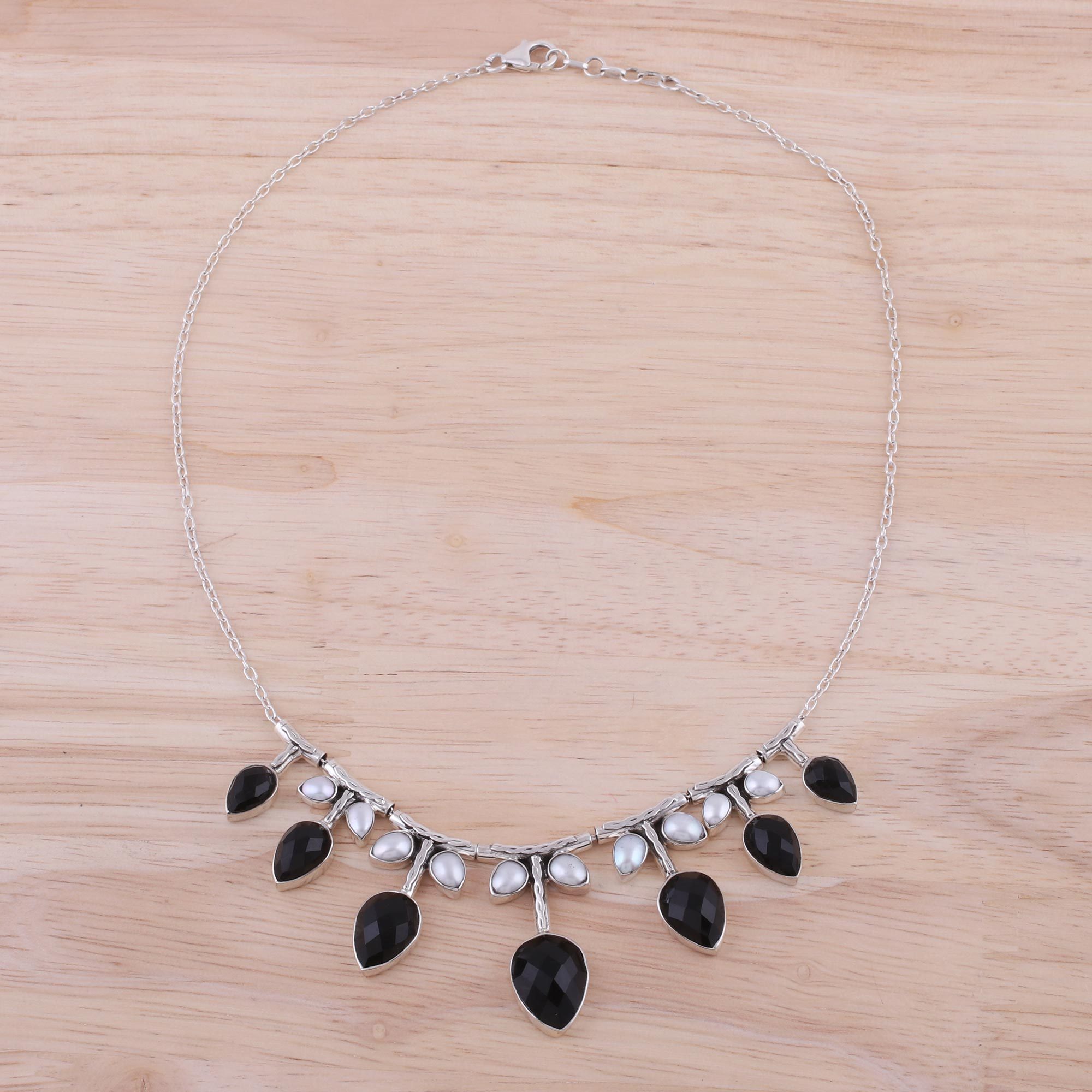 Cultured Pearl and Onyx Sterling Silver Waterfall Necklace, 'Monochrome Bouquet'