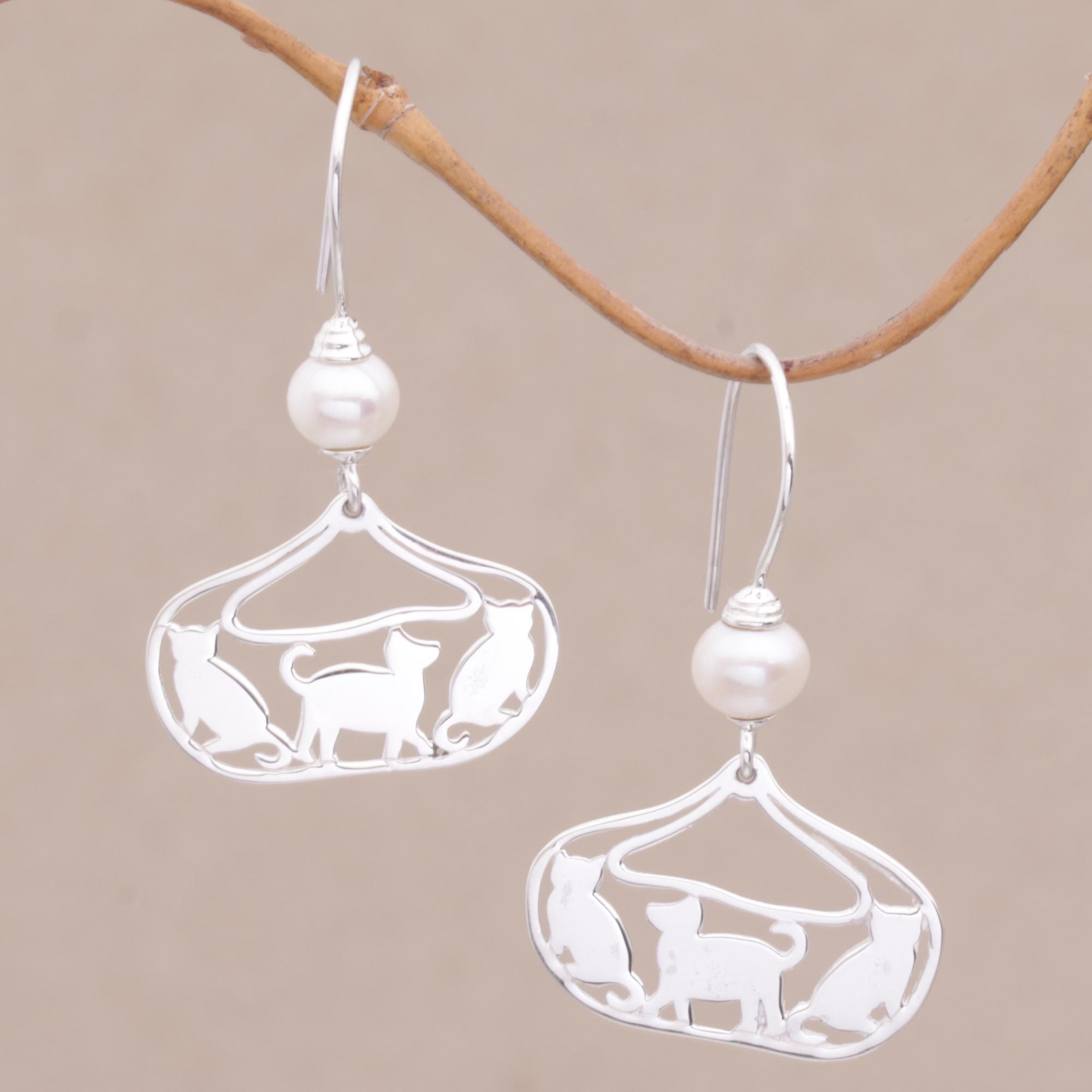 A parade of cats is crafted of sterling silver relief in this pair of Balinese dangle earrings, accented with glowing cultured pearls. The artisans at Bali Animal Welfare Association handcraft these earrings.