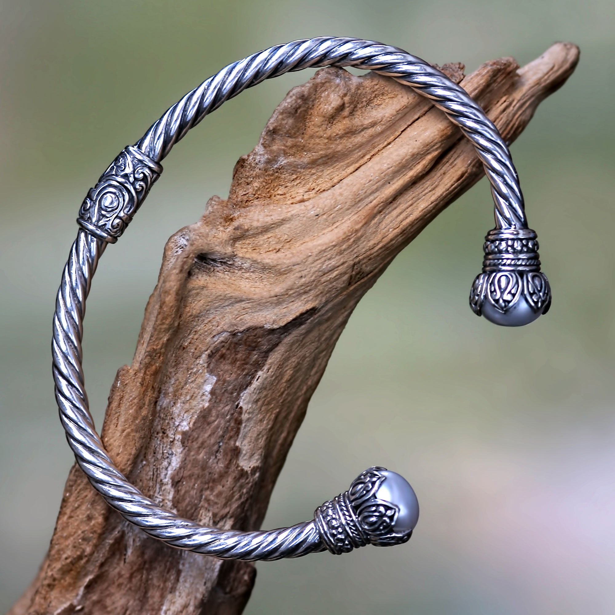 Sterling silver encircles the wrist like a strong rope, made pleasingly delicate in appearance by Balinese-style embellishments. White cultured pearls, like cotton bolls bursting forth from their pods, grace both ends of the bracelet. Pearl represents June´s birthstone. The cuff features a cleverly concealed hinge at the center for convenience. The original bracelet design is presented by Bali artisan Kadek Hendra.