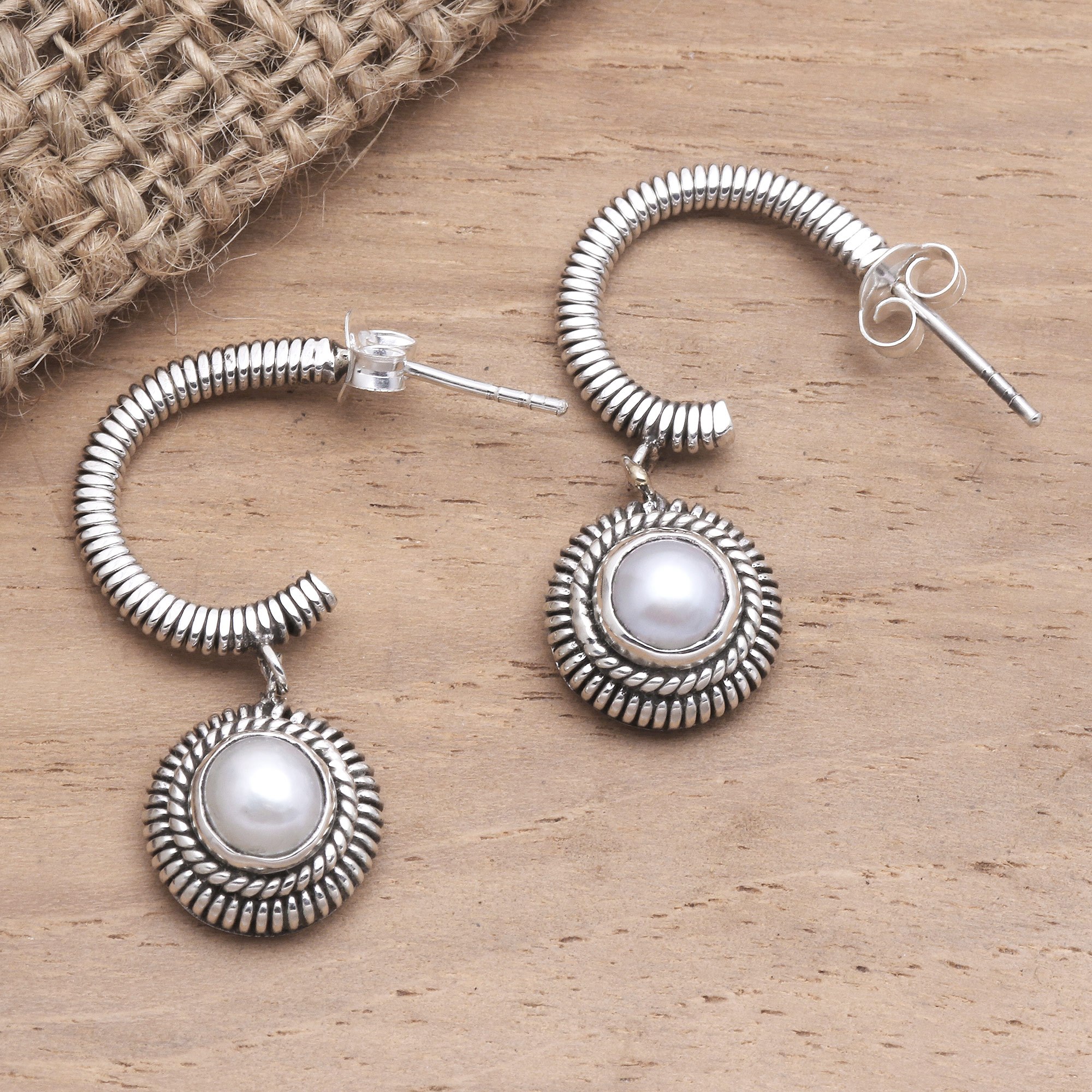 Create an aura of easy elegance with this pair of charming dangle earrings crafted by Java's Rosalia Tarigan. The artisan hand wraps a sterling silver wire frame around a glowing cultured freshwater pearl, while curved posts add an unexpected element to the pretty pair.