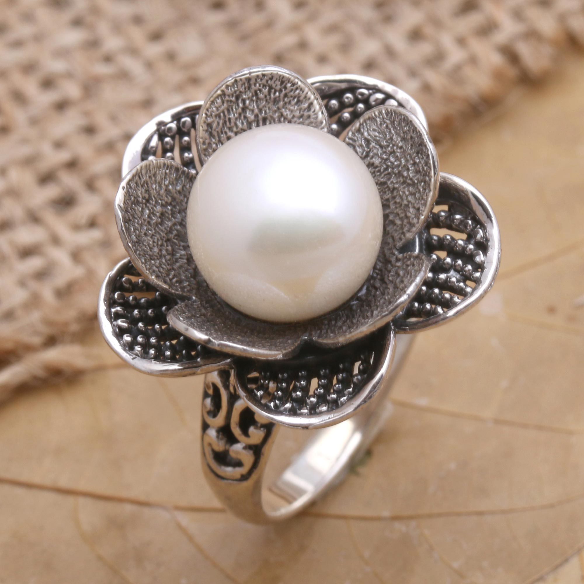 Centered with a large, glowing pearl, Budiharta's cocktail ring features a dreamy floral motif. The Balinese artisan hand crafts the ring from sterling silver, engraving each petal with textured patterns. The shimmering petals gently cradle a smooth, cultured freshwater pearl, dyed a pale peach.