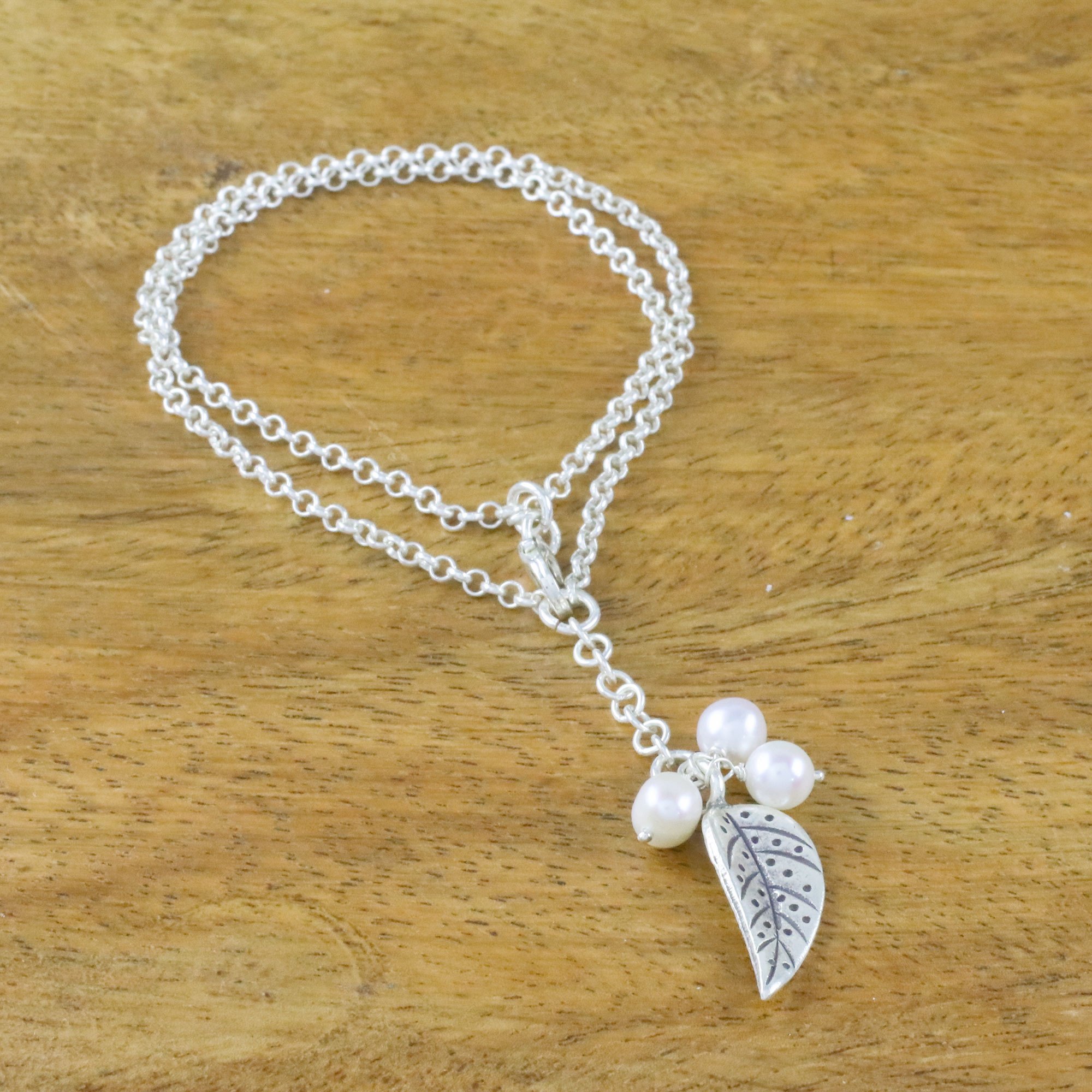 Crafted of silver by Karen hill tribe silversmiths, a lively leaf dangles from this Thai bracelet. Withaya Cheunjit presents the bracelet, circling the wrist with two lengths of sterling silver rolo chain. Glowing white cultured pearls accentuate the leaf charm.