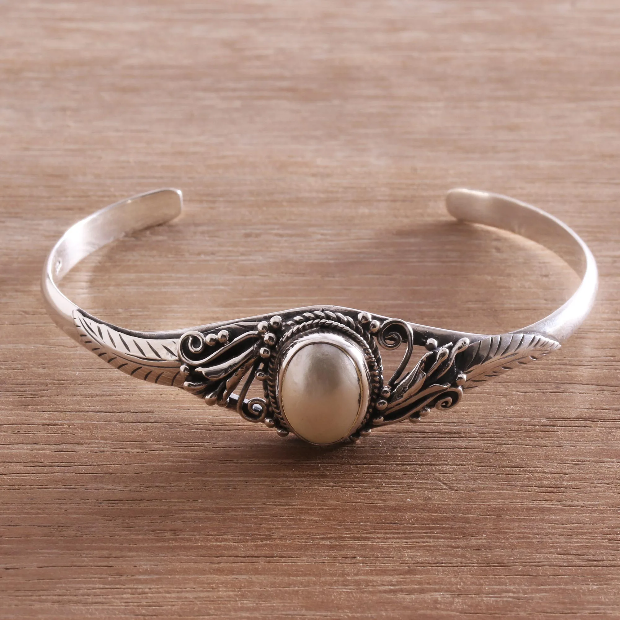 Cultured Pearl Pendant Cuff Bracelet from Bali, 'Moonlight Shade'