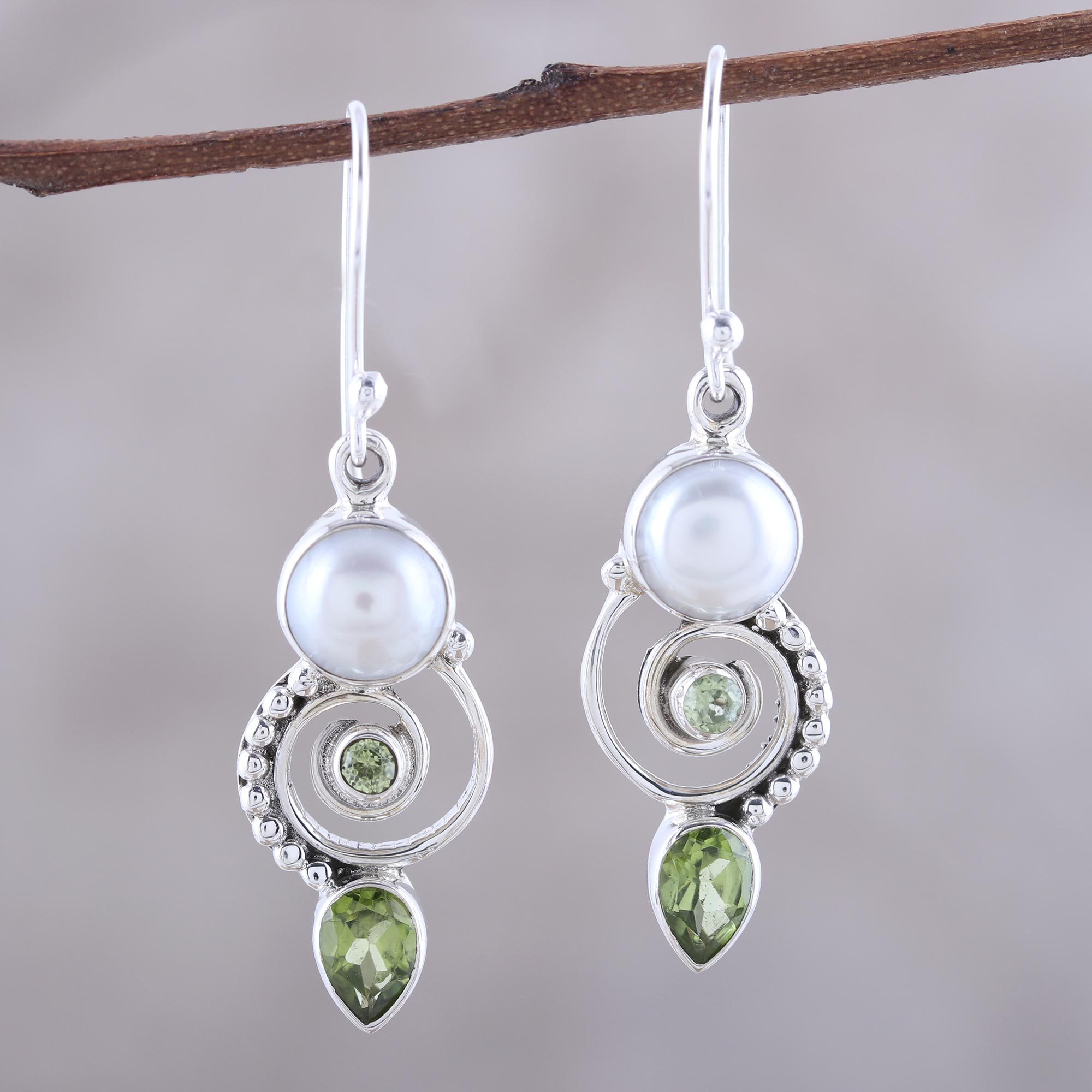 Sterling silver dots travel a spiral labyrinth between a cultured freshwater pearl and a tear drop of peridot in this gorgeous pair of dangle earrings. A round, faceted peridot rests in the center. Presented by Neeru Goel of India, these handcrafted earrings hang from sterling silver hooks.