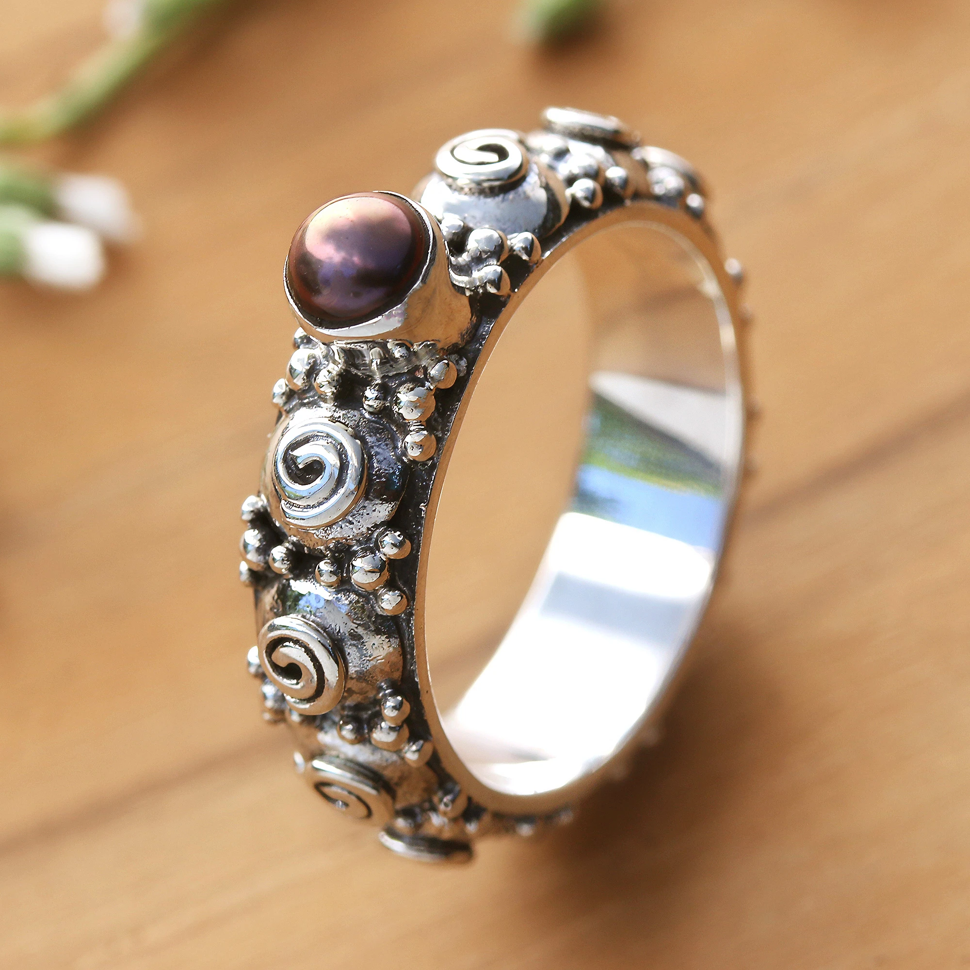 Joyful swirling motifs adorn the band of this single stone ring, which features a brown cultured pearl at the top that glistens. The ring is handcrafted from sterling silver by Balinese artisans, featuring a design by Buana, who has been perfecting his craft since childhood.