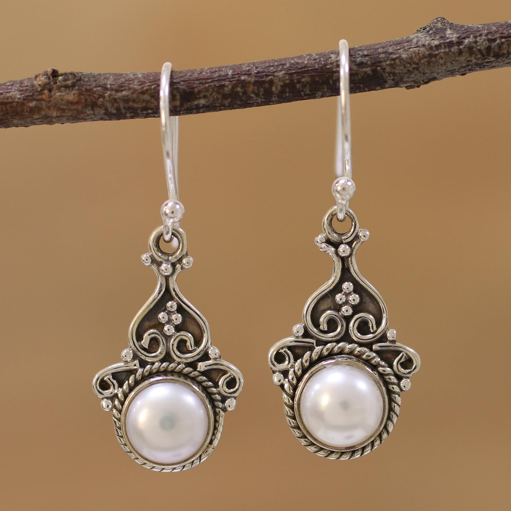 Cultured Pearl Sterling Silver Dangle Earrings from India, 'Crowned Charm'