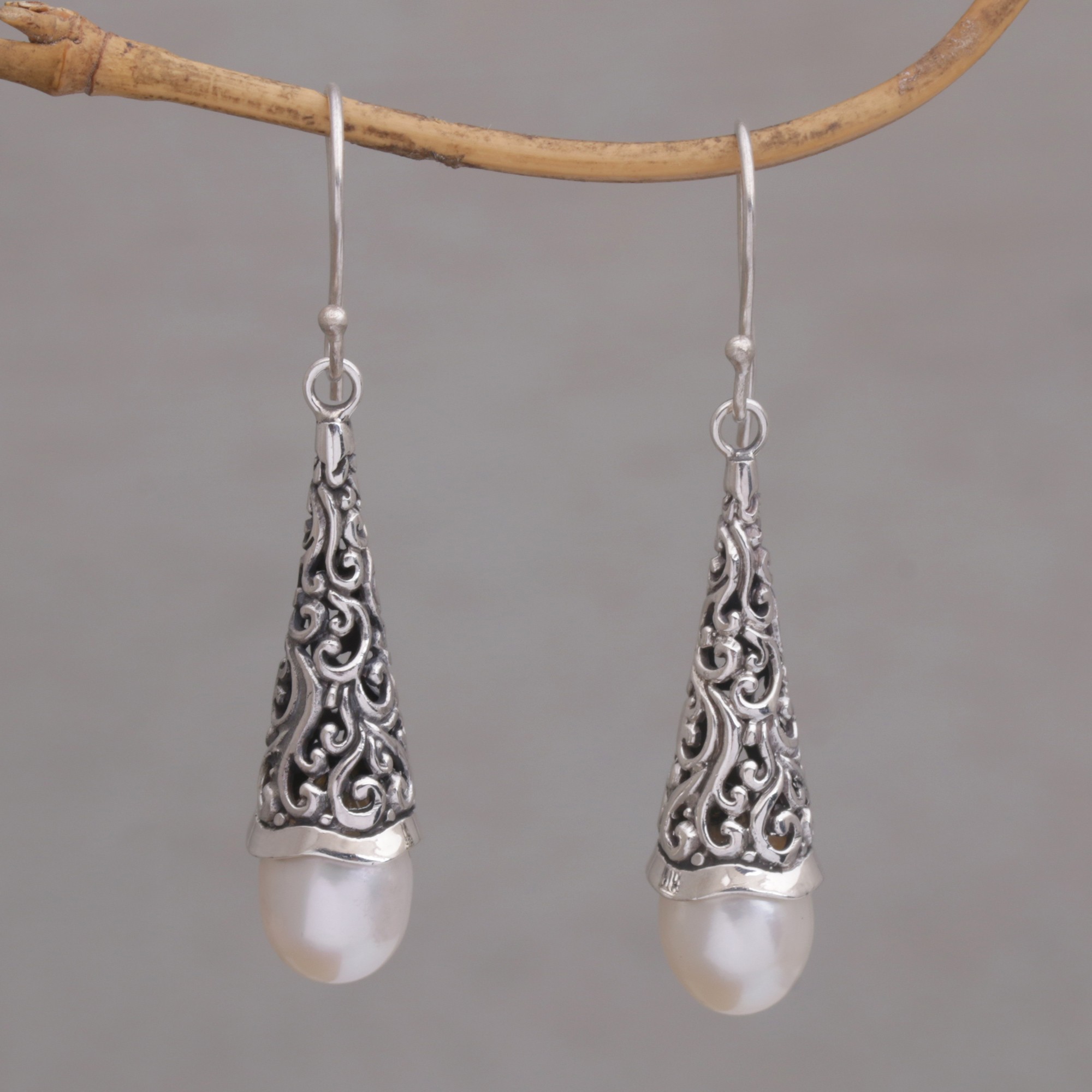 These earrings from Indonesian artisan Komang Wijayana are reminiscent of a raindrop slowly descending from the trees after an afternoon rain. Each earring showcases a cultured freshwater pearl suspended from a cap of sterling silver with a floral motif.
