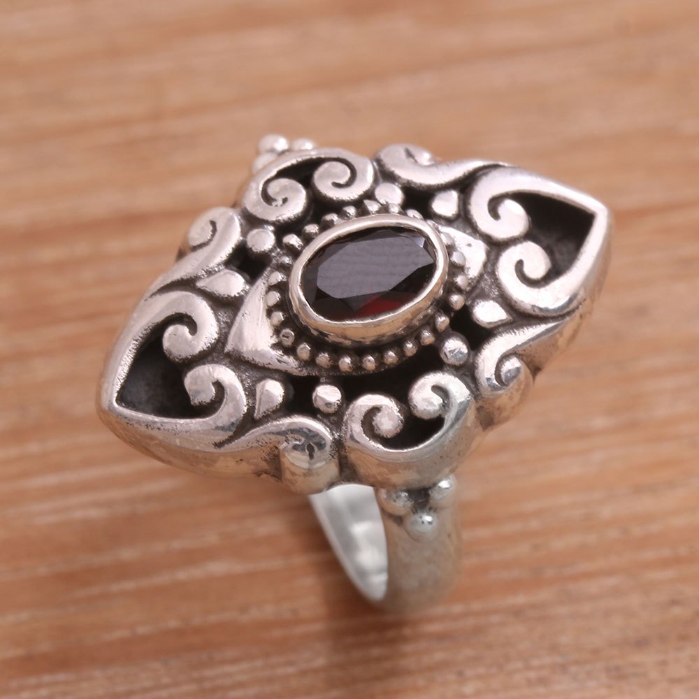 Curl Motif Garnet Cocktail Ring from Bali, 'Fiery Soul'