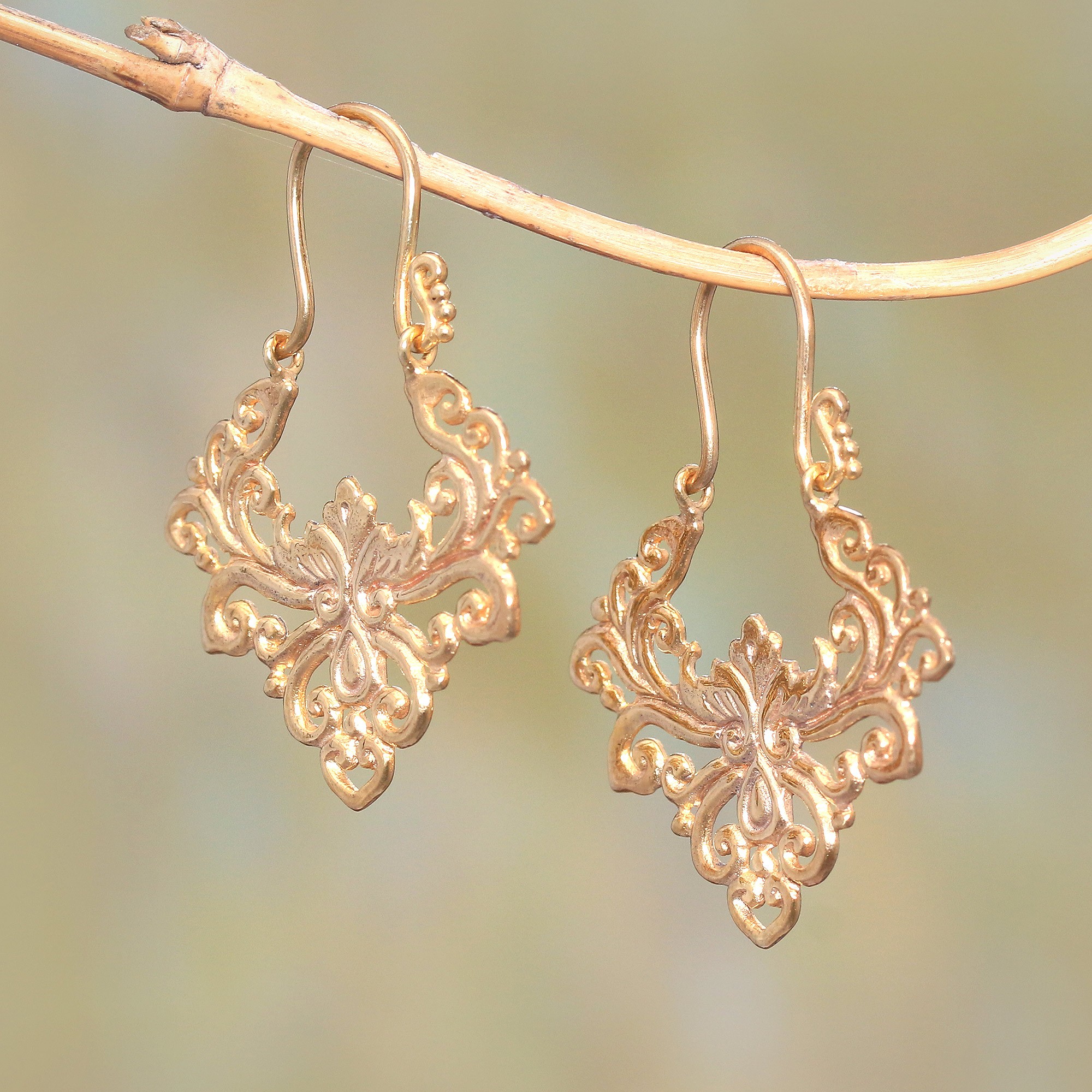 Curl Pattern Gold Plated Brass Drop Earrings from Bali, 'Alam Pride'
