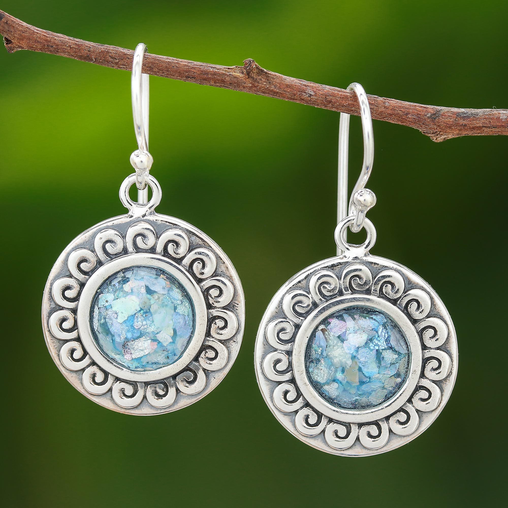 Framed by curling tendrils of sterling silver, two pieces of glittering blue Roman glass are featured in this pair of dangle earrings from Thailand. Michael Krainer creates the earrings, crafted with beautiful Roman artifacts recovered from dig sites that are up to 2,000 years old.