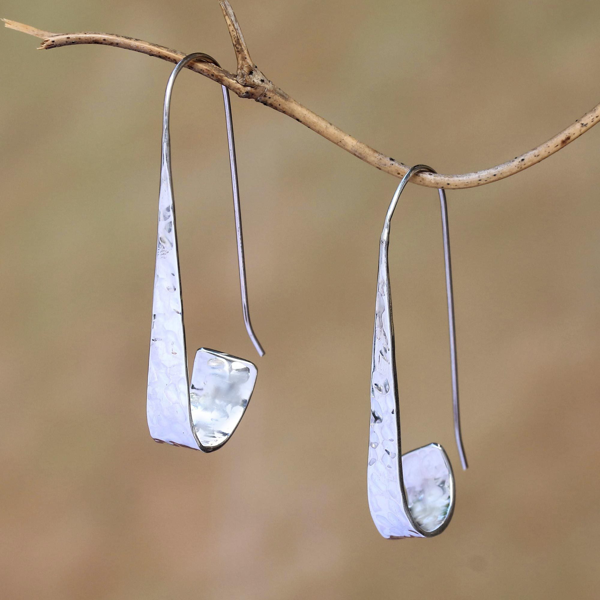 For a contemporary accessory, Balinese artisan Made Mustika designs this pair of drop earrings. He handcrafts the earrings of sterling silver, featuring triangle-like shapes that curl below the ear. Each earring is accentuated by a combination of finishes that resemble ocean waves.