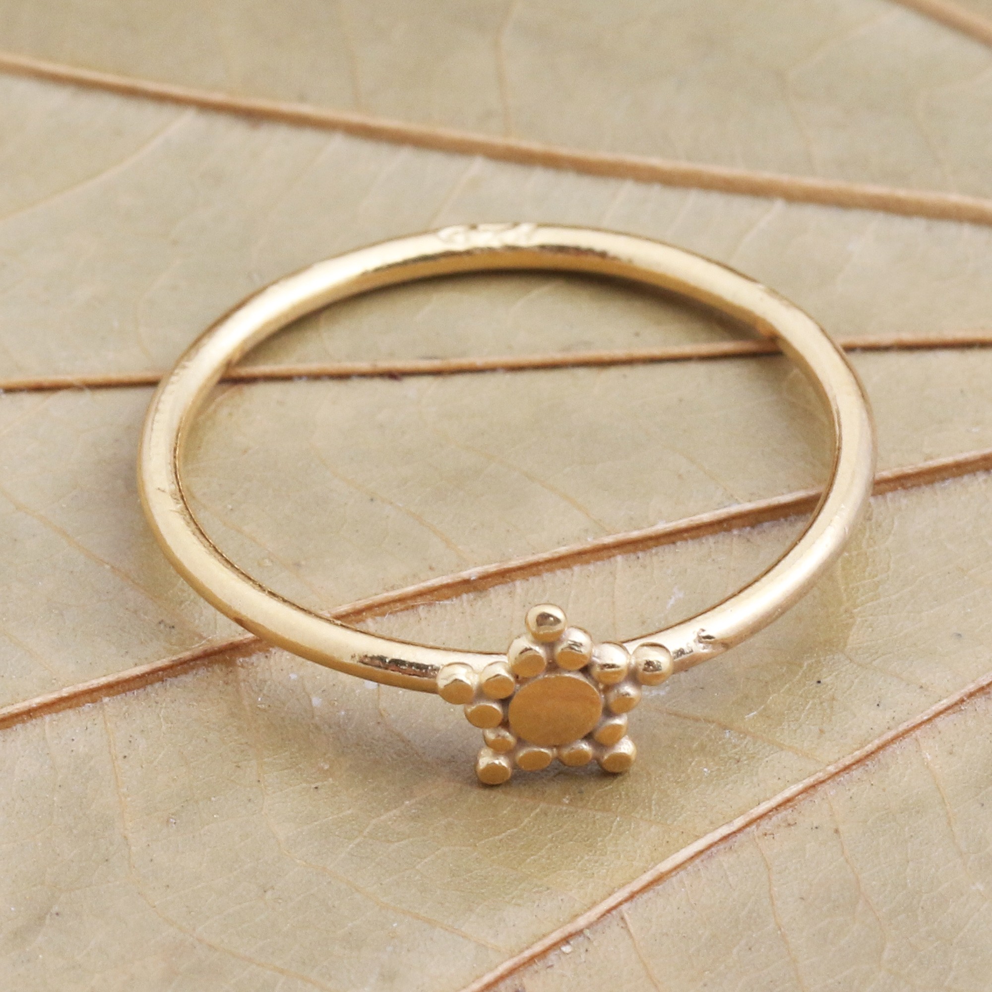 This dainty band ring from Ketut Sulastri in Bali is an understated way to express your style. The slender band and beaded star accent are crafted of 18k gold plated sterling silver.