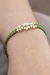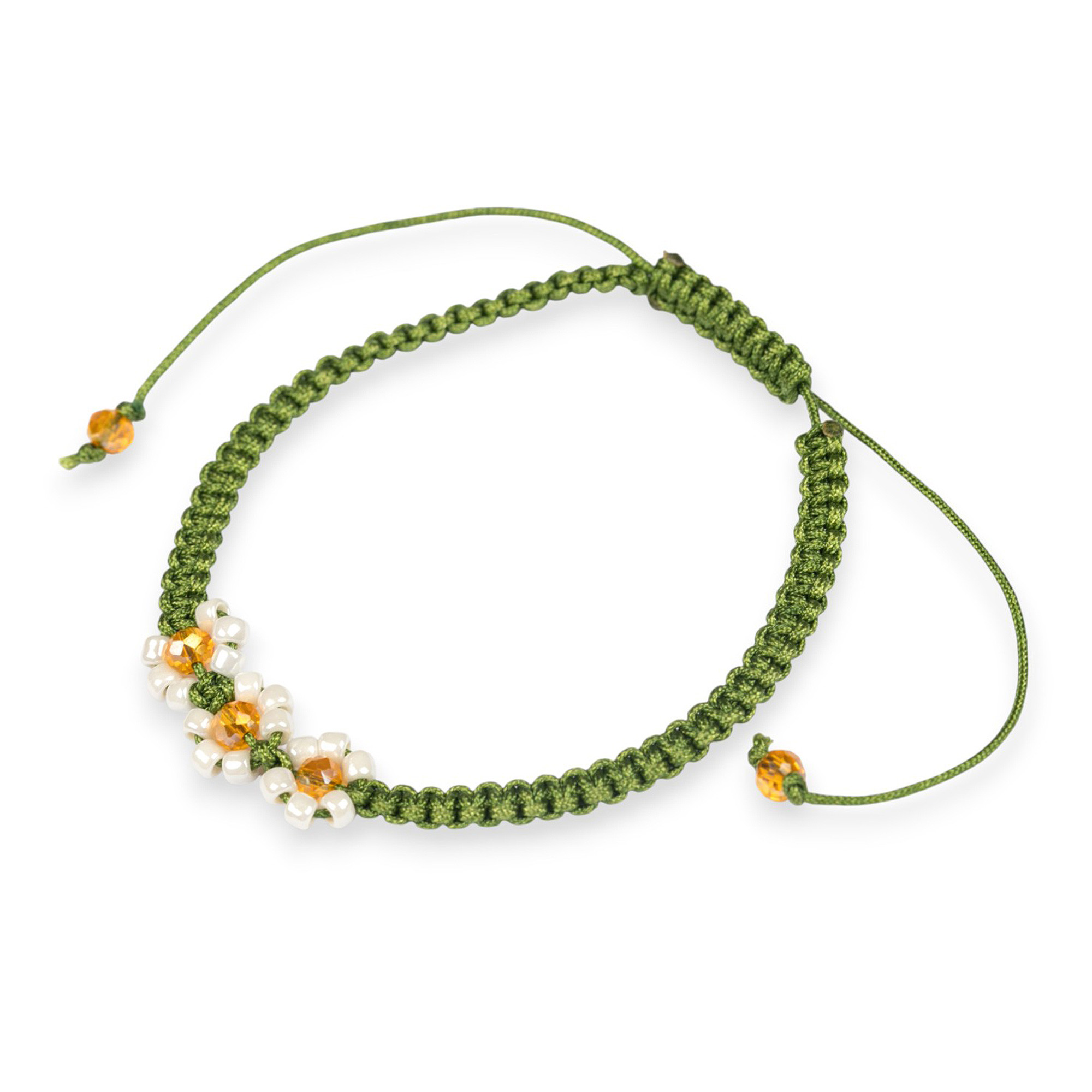 The Balinese island lets enchanting daisies create a promise of joy around this macrame bracelet by Ayu Widiani. Crystal beads decorate the front with daisy-like pendants, whereas green polyester cords form the band, accented with a sliding knot and little details that make you feel in an eternal spring.