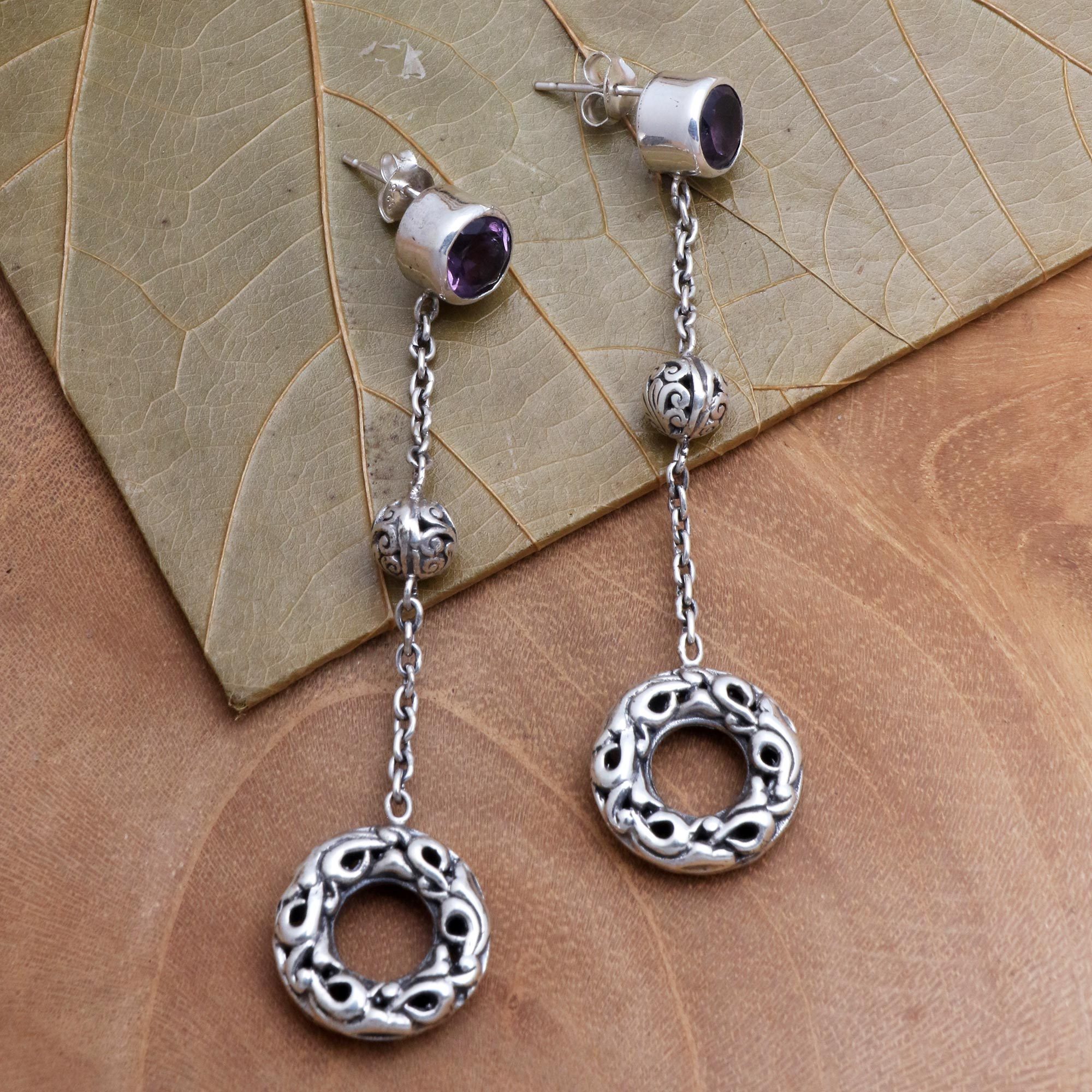 In these earrings from Rosalia Tarigan of Bali, amethyst studs totaling 2.5 carats host ornate pendulums of sterling silver. Small silver balls are stationed above round loops detailed with a vine-like motif. The earrings sway gracefully from sterling silver hooks.