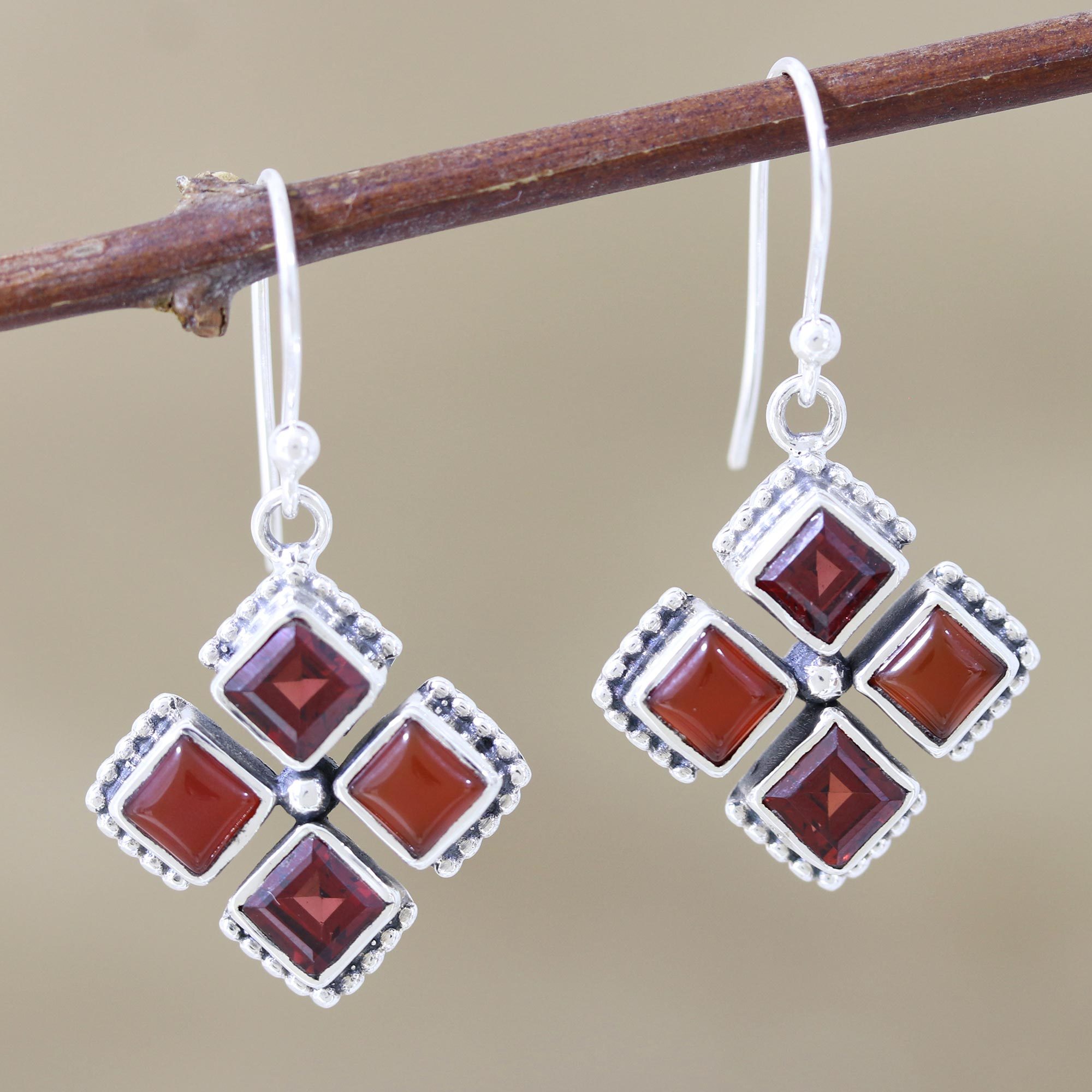 Garnet squares off with carnelian in these pretty dangle earrings from India's Neeru Goel. Artisans craft the earrings from sterling silver with beaded edges.