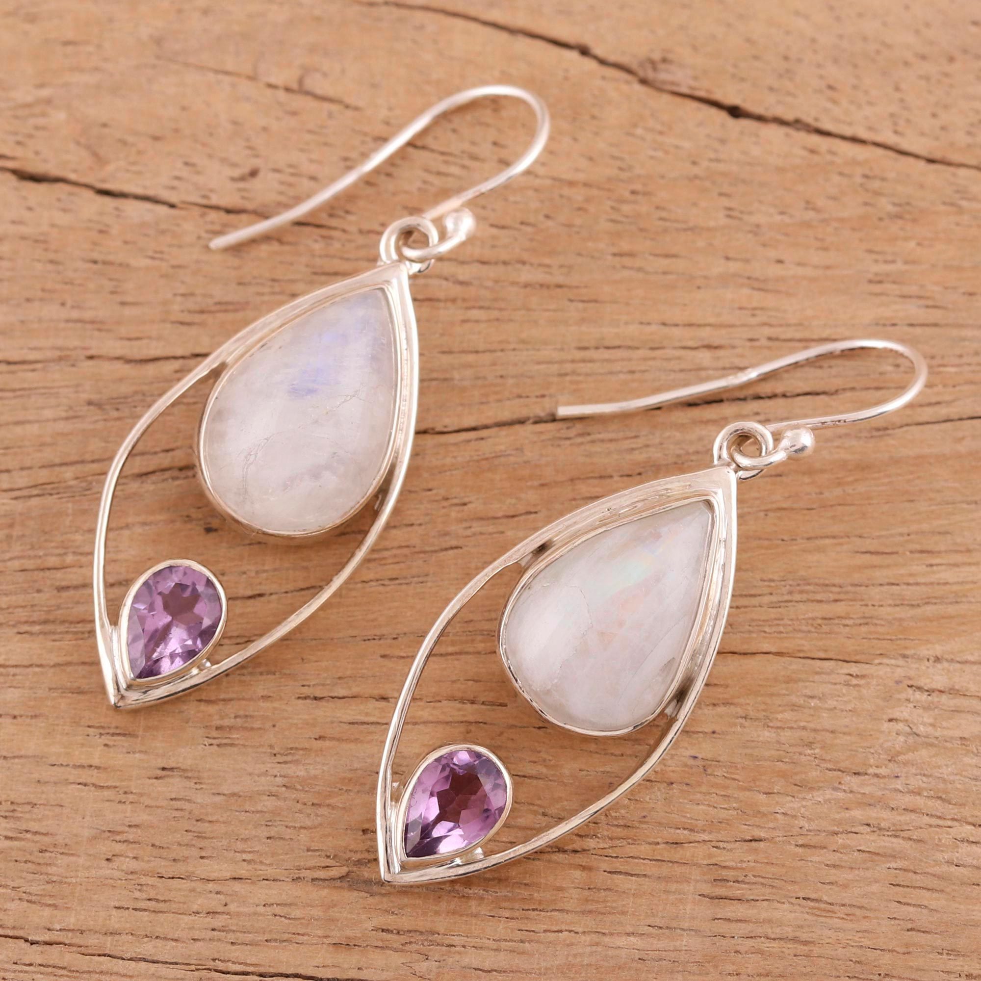 A happy marriage of rainbow moonstone and amethyst distinguishes these dangle earrings from Shanker in India. Within sterling silver marquise shapes, teardrop-shaped gemstones complement one another. The pretty earrings swing from sterling hooks.
