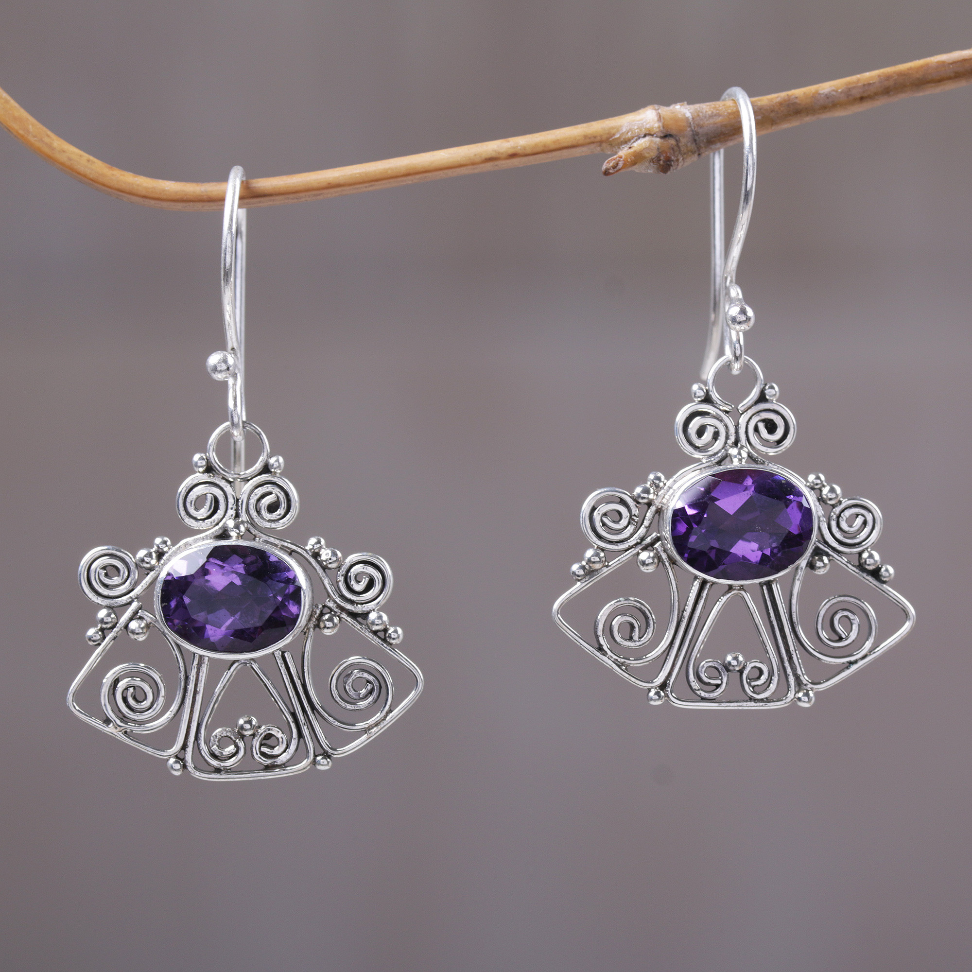 In the shape of a delicate bell, these earrings are true to the Balinese style. A center stone of amethyst takes these earrings to new heights of beauty and style. .925 sterling silver shaped into an ornate pattern surrounds a brilliant amethyst stone. By Artist Sukartini, these exquisite earrings are a colorful classic and a tasteful addition to any jewelry collection.