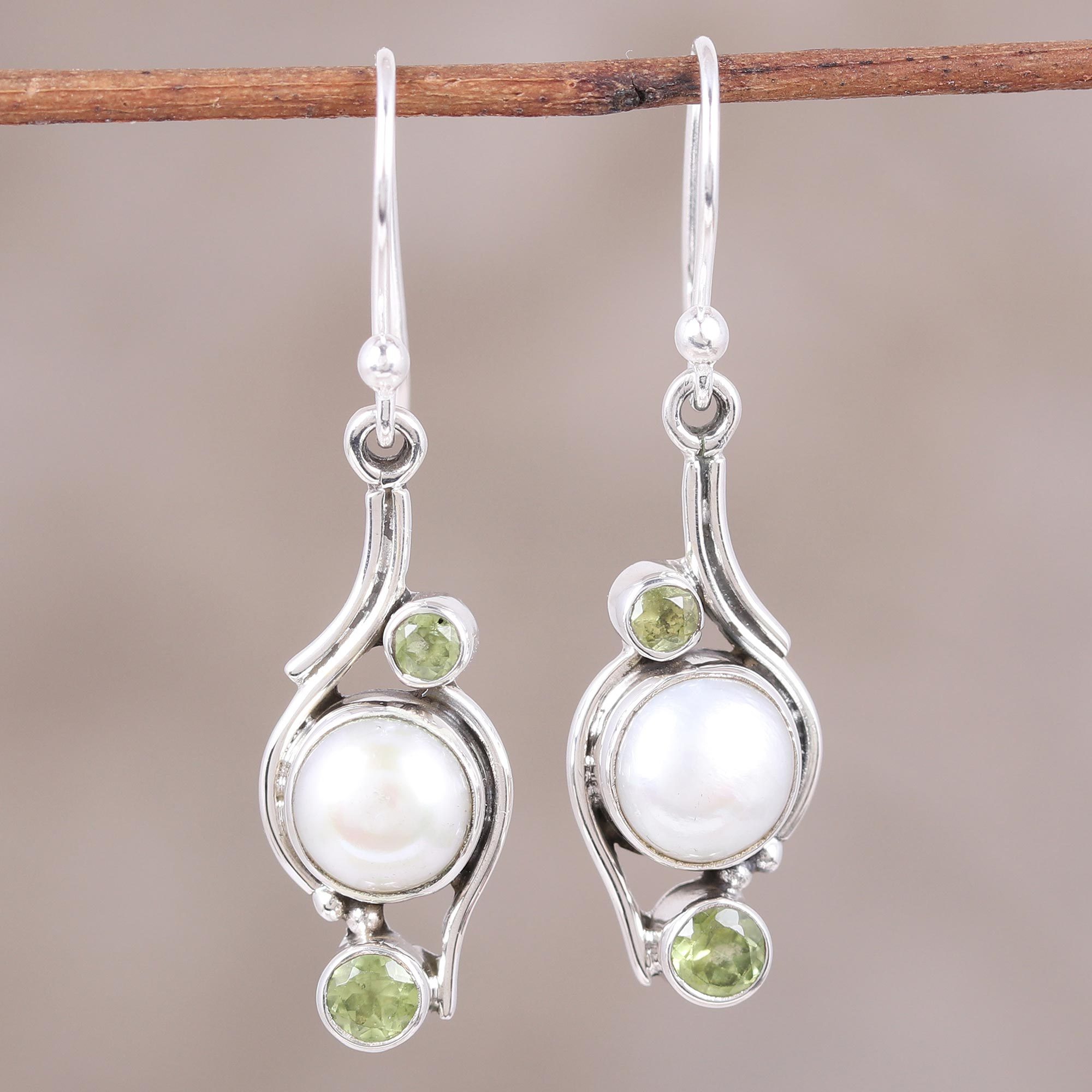 Display these opalescent dangle earrings from India which exude a subtle beauty. Crafted by Shanker, round white pearls are accented by green peridots and drop set in sterling silver wire earrings. Feel the breeze of summer as you wear these pearly creations to accent your wardrobe.
