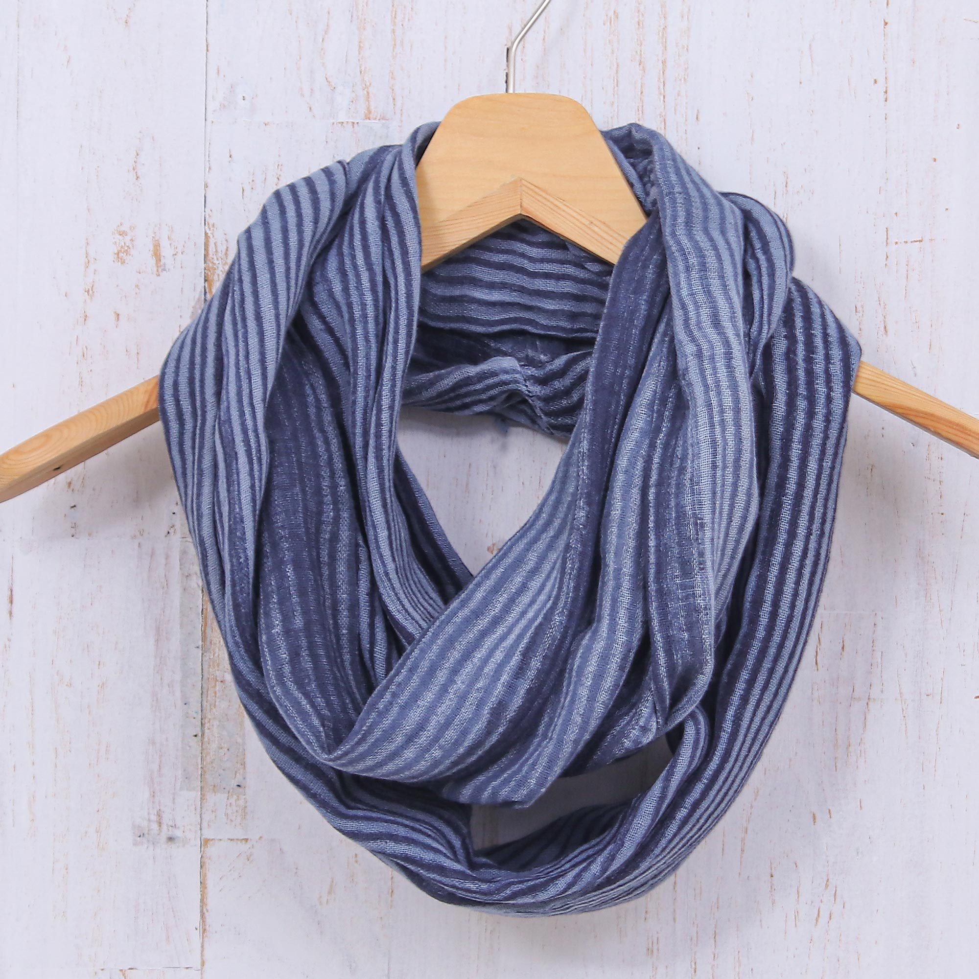 Vinita of Thailand presents this lovely striped scarf in dark blue and white. Thai artisans masterfully weave this cotton infinity scarf by hand, creating the perfect accessory for a chilly day.