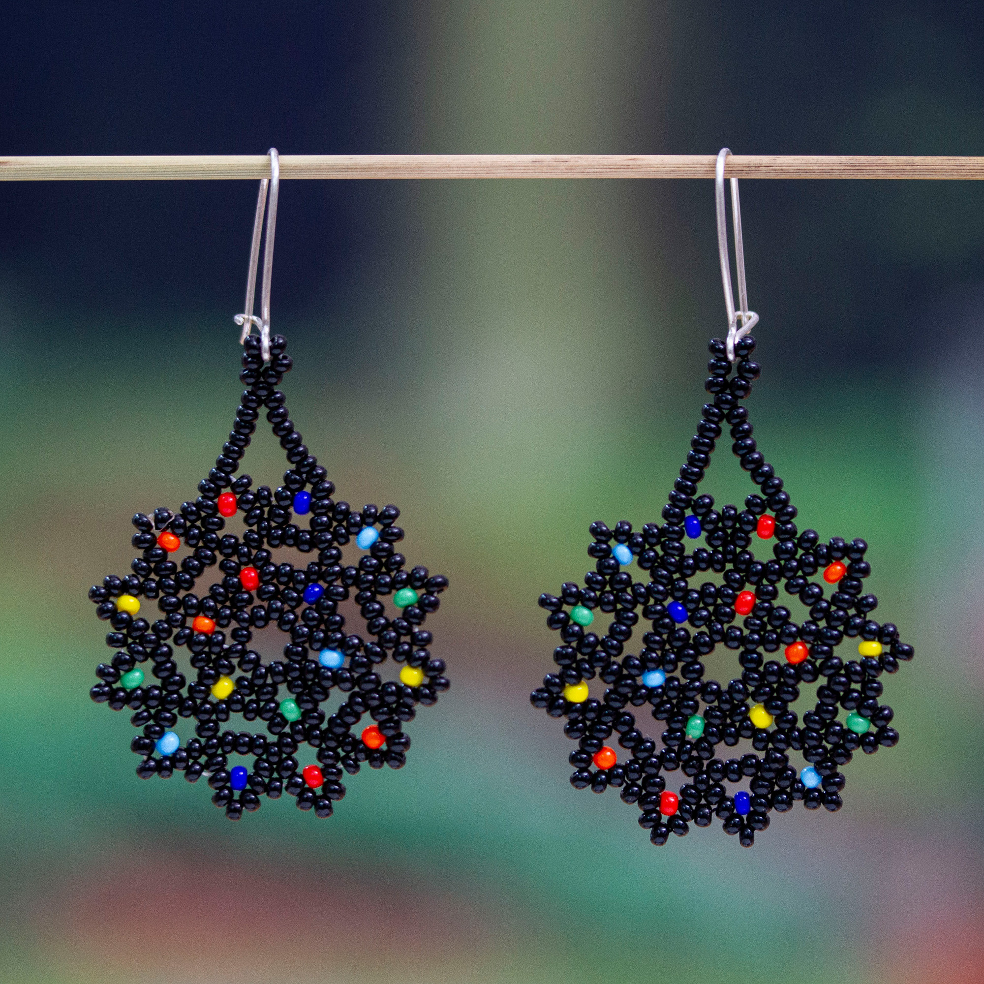 Mexican artisan Adriana Trejo uses black and multicolored seed beads to handcraft star medallions. Dancing on sterling silver hooks, these earrings add a sophisticated touch to your wardrobe.