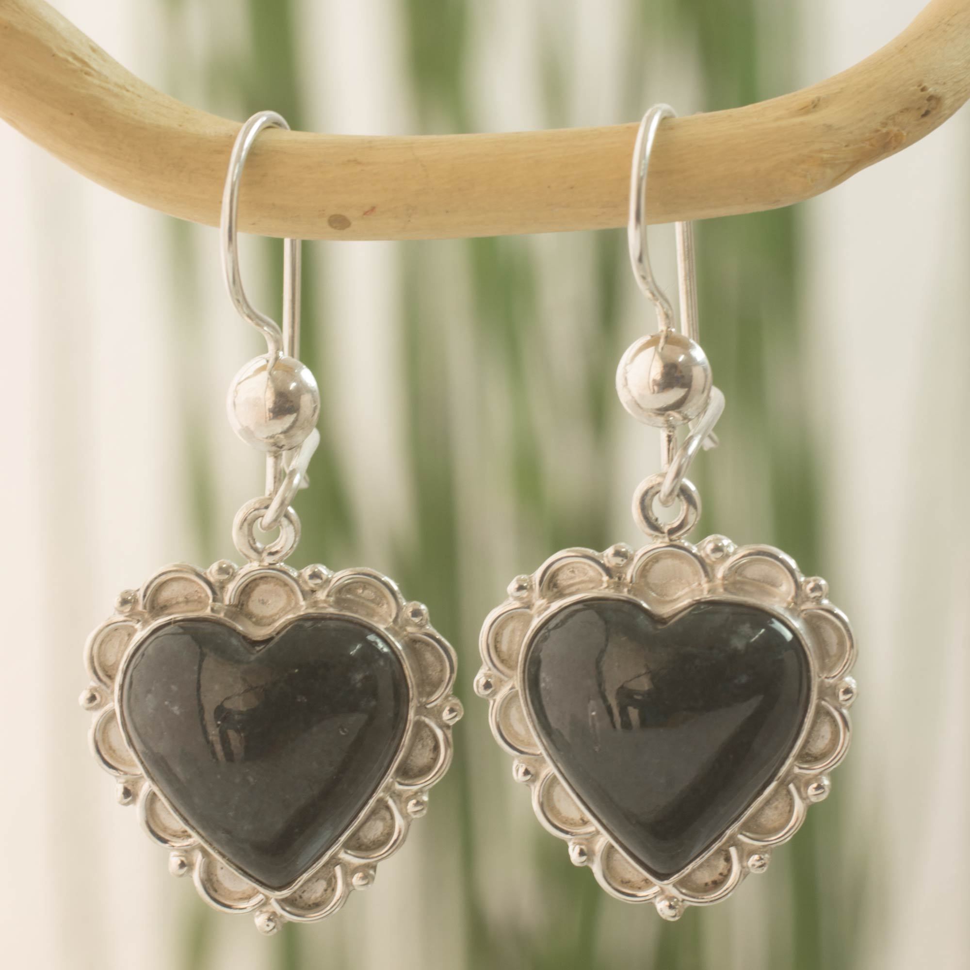 Zandra Lorena Sajbin designs a gorgeous pair of heart earrings surrounded by sterling silver petals. Inspired by the exotic beauty of the zinnia, she crafts the earrings by hand and centers them with glossy dark green jade.