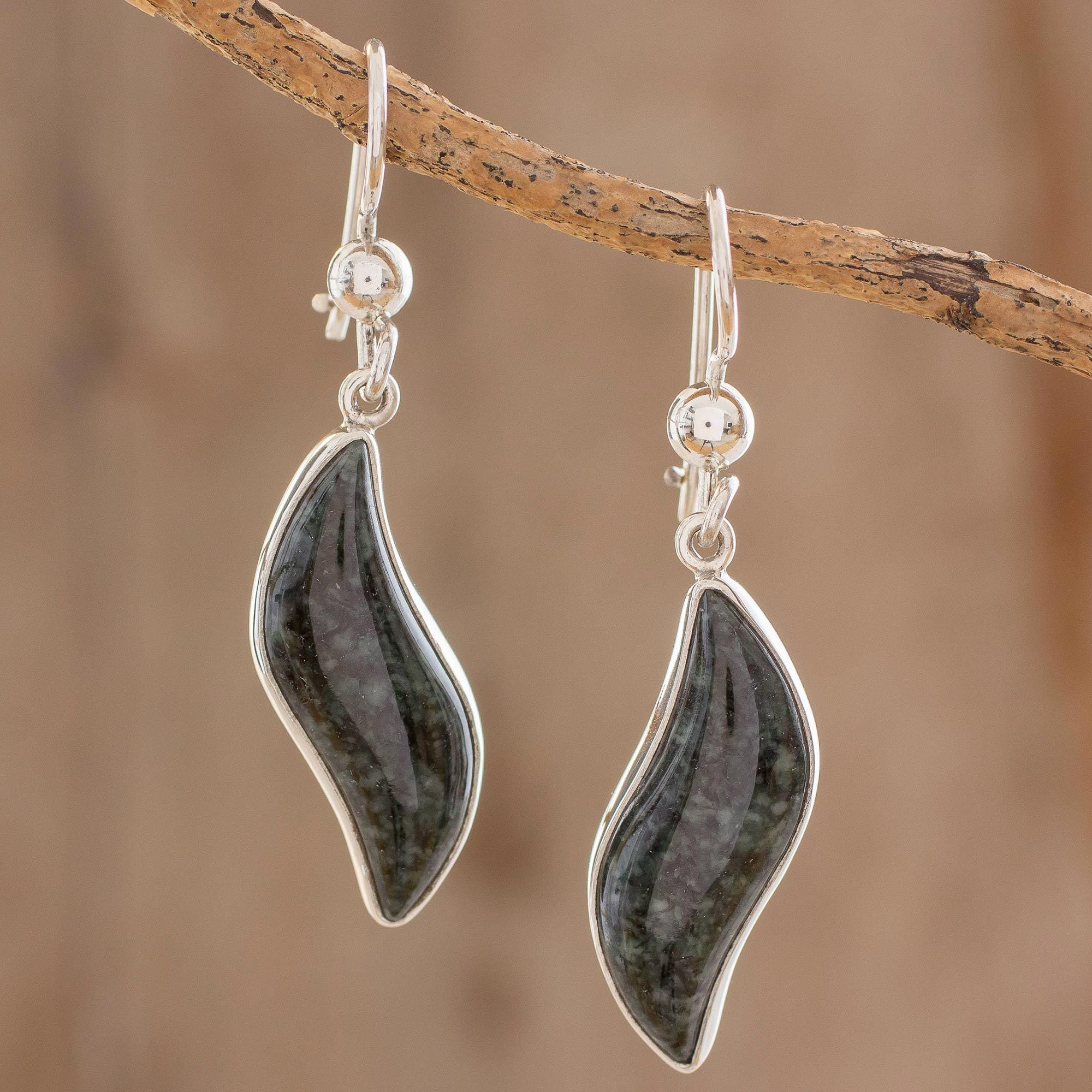 Set in sterling silver, dark green jade leaves undulate in the soft Guatemalan breeze. Zandra Lorena Sajbin celebrates the endless beauty of jade, sacred to the ancient Maya, with the exquisite design of these hand crafted earrings.