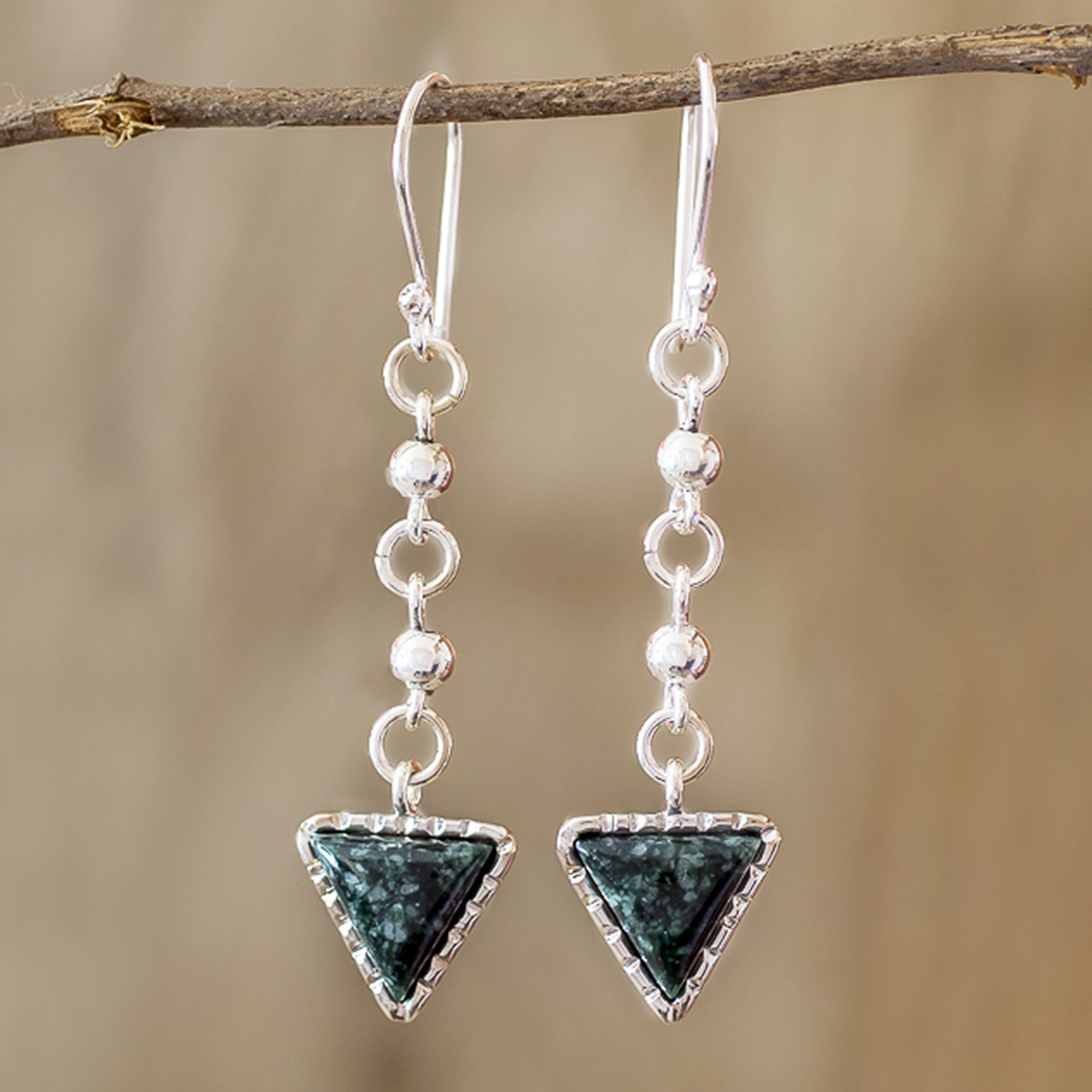 Revered by the ancient Maya, jade is also treasured by contemporary jewelry aficionados for its rich, natural color. Carolina Quiroa designs these pretty dangle earrings from triangle cabochons of dark green jade and chain links of polished sterling silver.