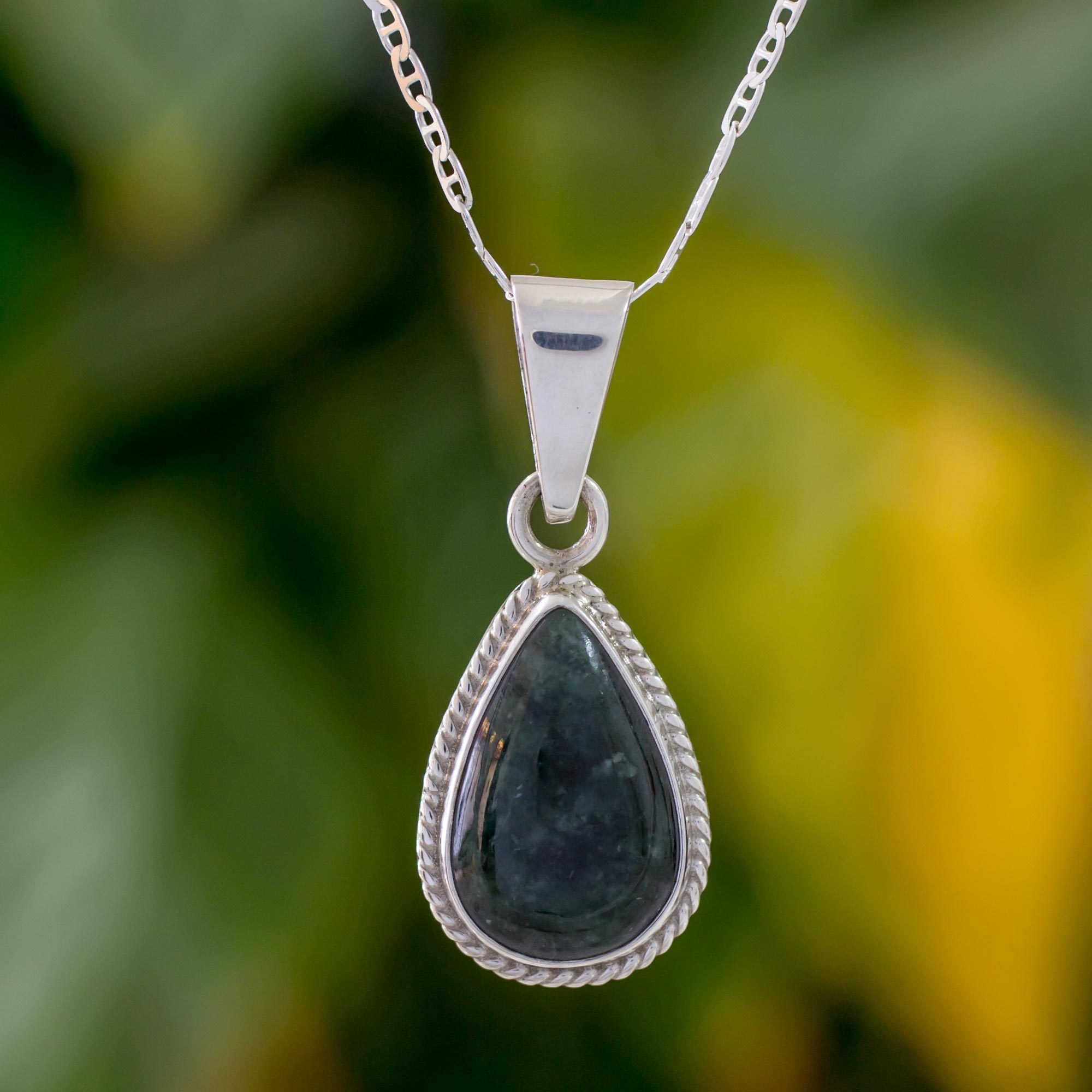 A teardrop stone of natural, dark green jade centers a length of mariner chain in this pendant necklace from Guatemala. Designed by Zandra Lorena Sajbin, this necklace is handcrafted with sterling silver rope motifs that capture the beauty of Mayan jewelry.