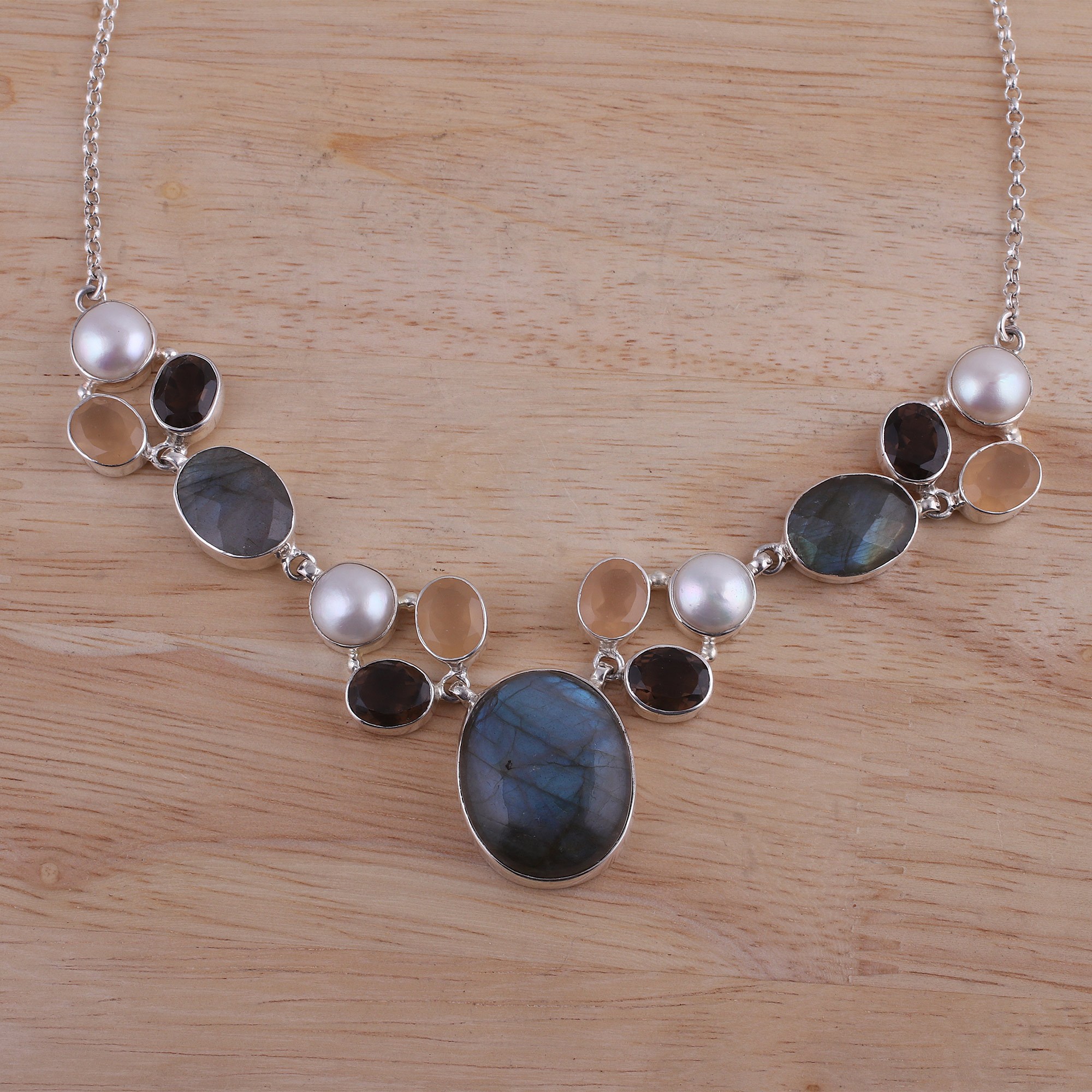 Possessing a dusky beauty, this pendant necklace is centered by labradorite, onyx, smoky quartz, and cultured pearls that are connected by links of sterling silver. Designed by Indian artisan Neetu Barathi, this pendant necklace circles the neck with sterling rolo chain, featuring an adjustable length.