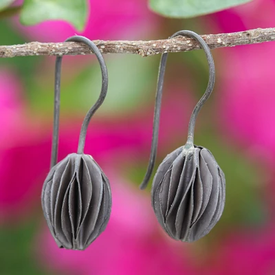 Darkened Modern Textured Silver Floral Bud Drop Earrings, 'Precious Flower Bud'