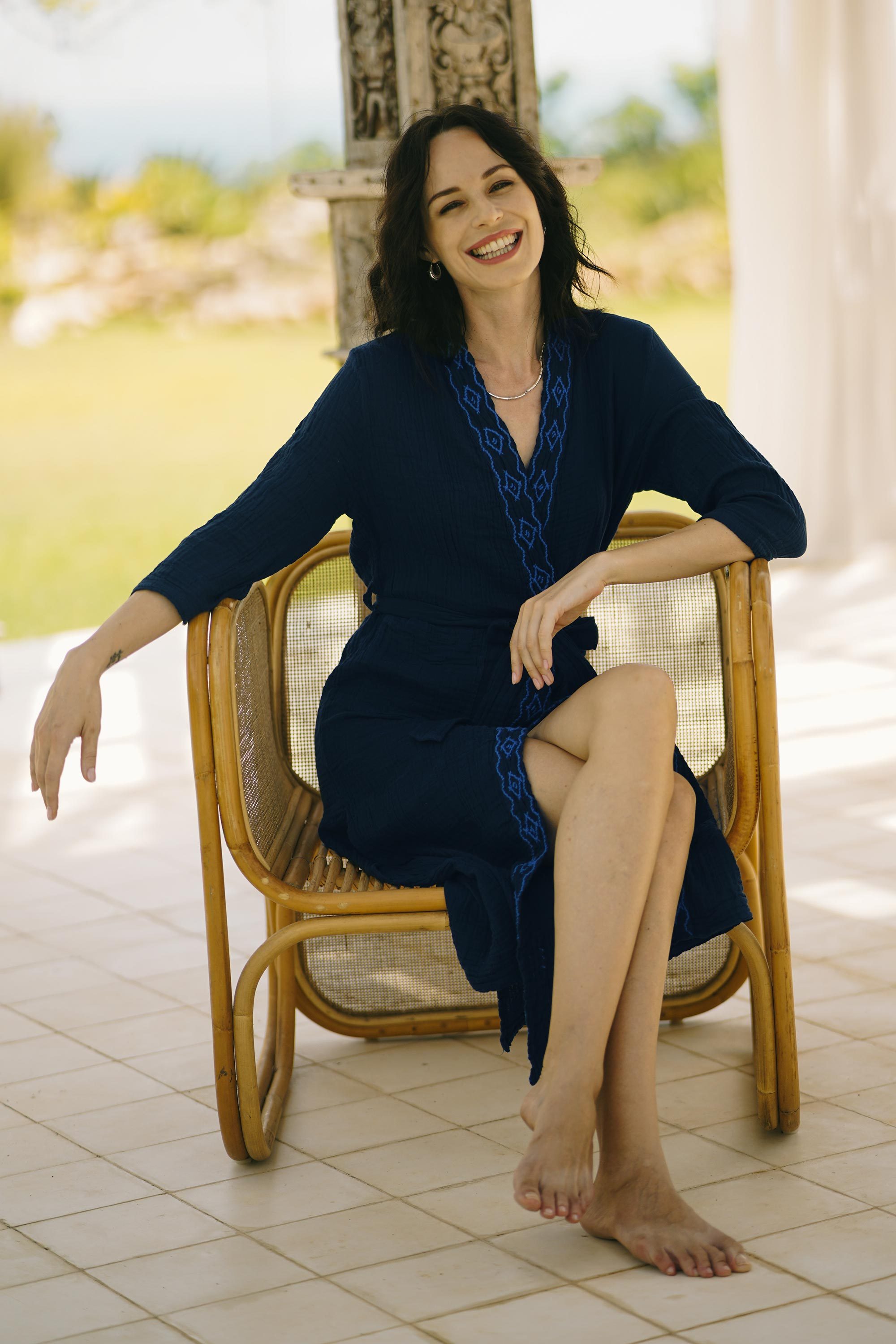 For a relaxing addition to your wardrobe, Thai artisans create this elegant robe. Woven from midnight blue cotton to create a ruched texture, this robe is presented by Ying and Joy. Diamond patterns in sapphire are embroidered by hand along the front hem of this robe, which features two front pockets and a tie belt.