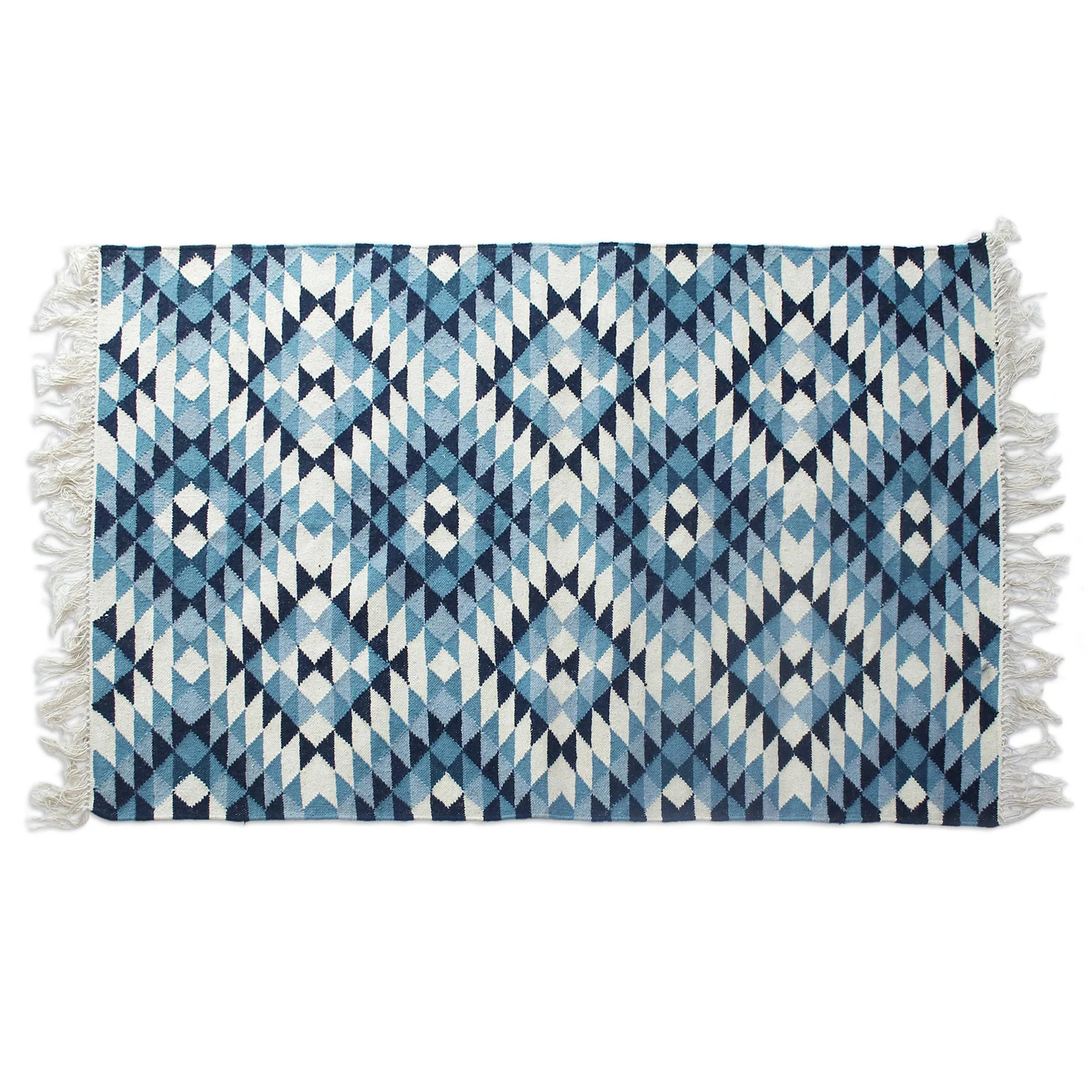 Diamond-Patterned Blue-Toened 100% Wool Dhurrie Rug (4x6), 'Fabulous Blue'