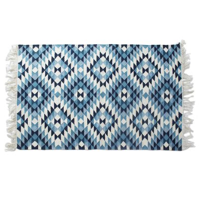 Blue is fabulous when handwoven in a classic dhurrie rug presented by India's Sonik Sethi. A talented team uses wool and traditional methods to bring to life the geometric pattern that characterizes this fringed rug, whose palette of ivory, indigo and cerulean hues invites cool vibes to your days.