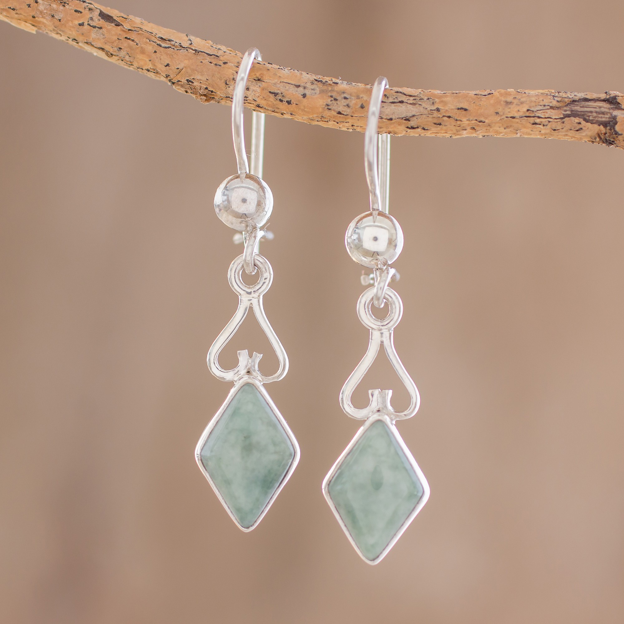 Dangling from sterling silver hooks, two marvelous diamonds carved of natural apple green jade form these elegant earrings. Guatemalan artisan Zandra Lorena Sajbin crafts this fabulous accessory, inspired by the pre-Hispanic history of jade, which was coveted among Mayan cultures.